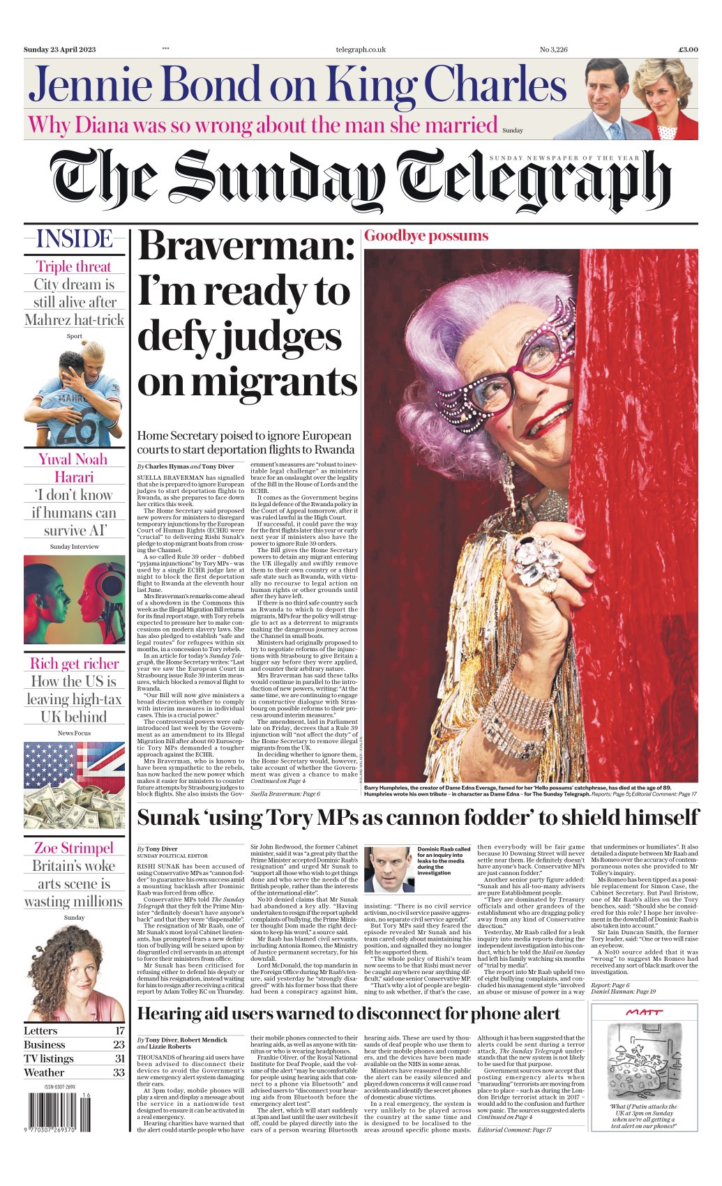 Sunday Telegraph reports Home Secretary Suella Braverman is prepared to disregard European judges, initiating deportation flights to Rwanda to halt small boats crossing the Channel.