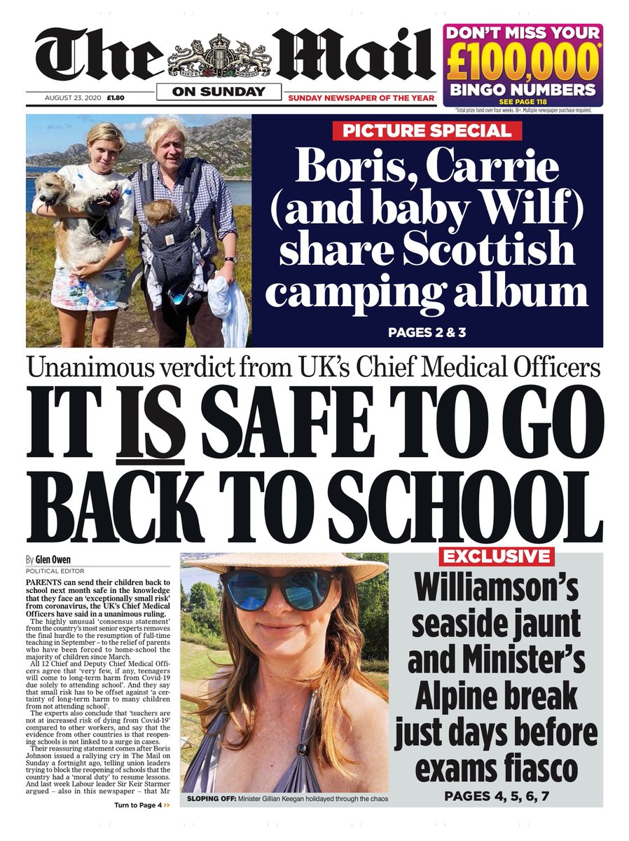 The Mail On Sunday reports that the UK’s chief medical officers have decided it is safe to send children back to school next month.