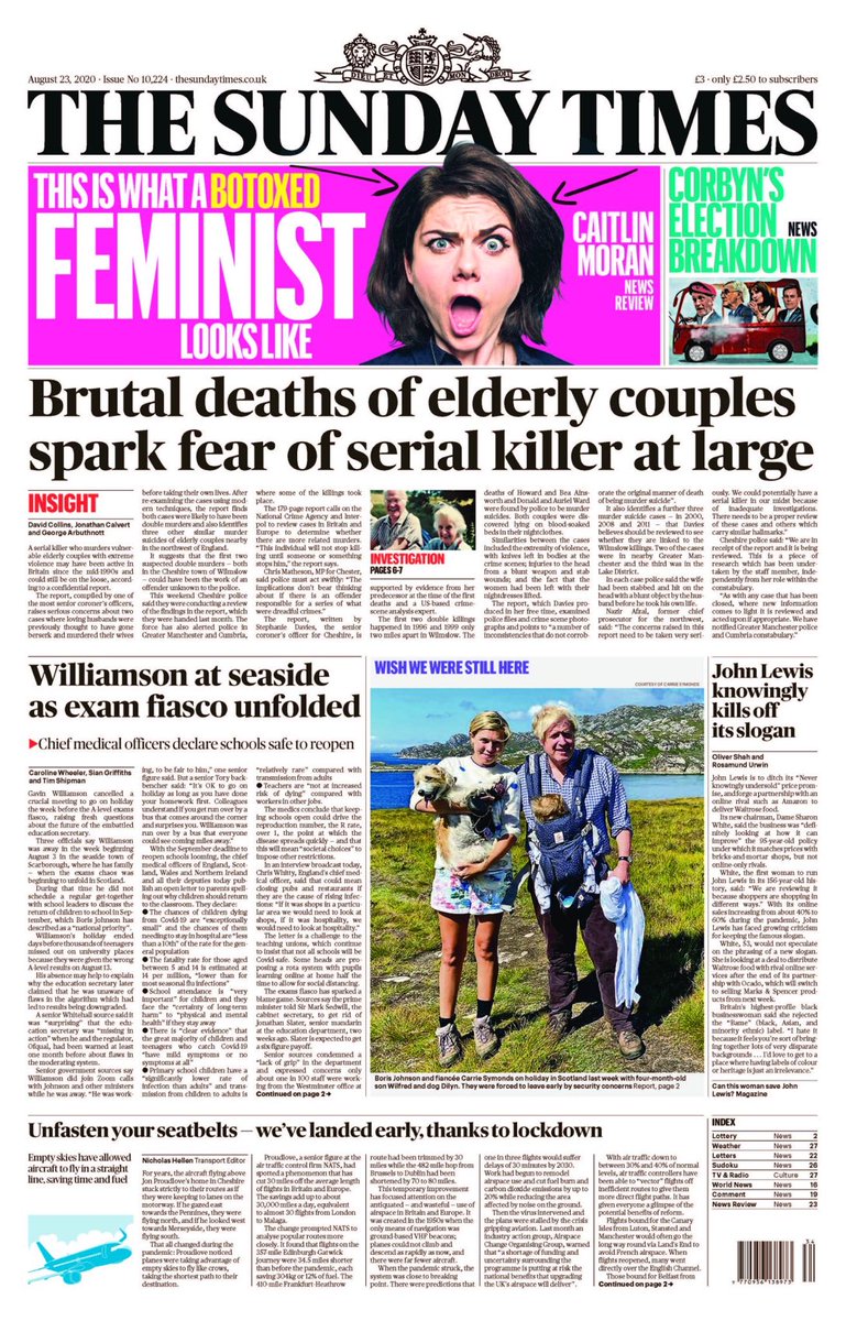 The Sunday Times leads on reports a serial killer who attacks elderly couples with “extreme violence”, has been active in Britain for up to 25 years.