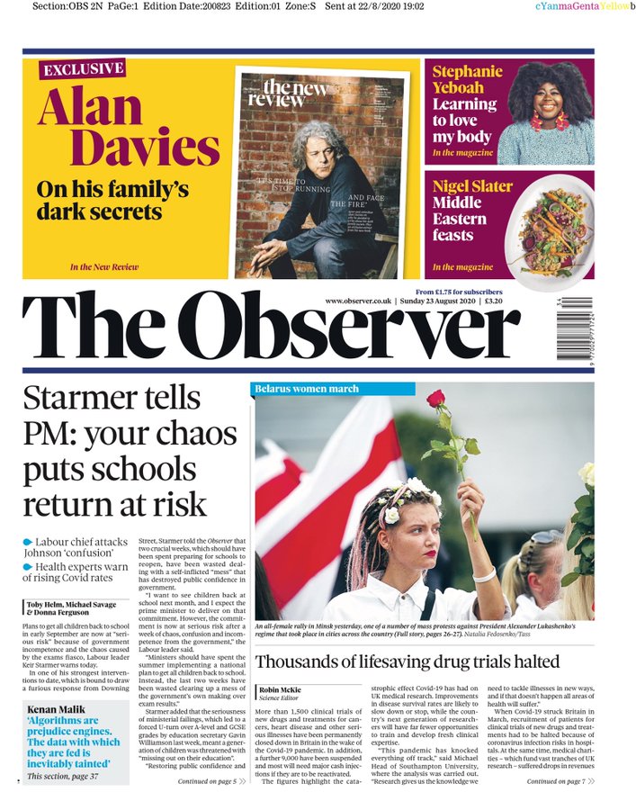 The Observer reports on accusations from Labour leader Sir Keir Starmer that the exam grading issues have jeopardised the government’s chances of getting pupils back to school as promised early next month.