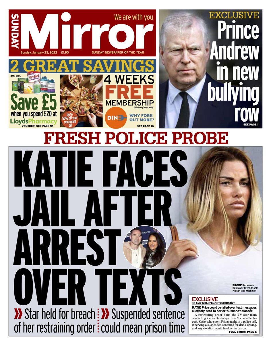 According to the Sunday Mirror, Katie Price could face jail for allegedly breaking the terms of a restraining order.