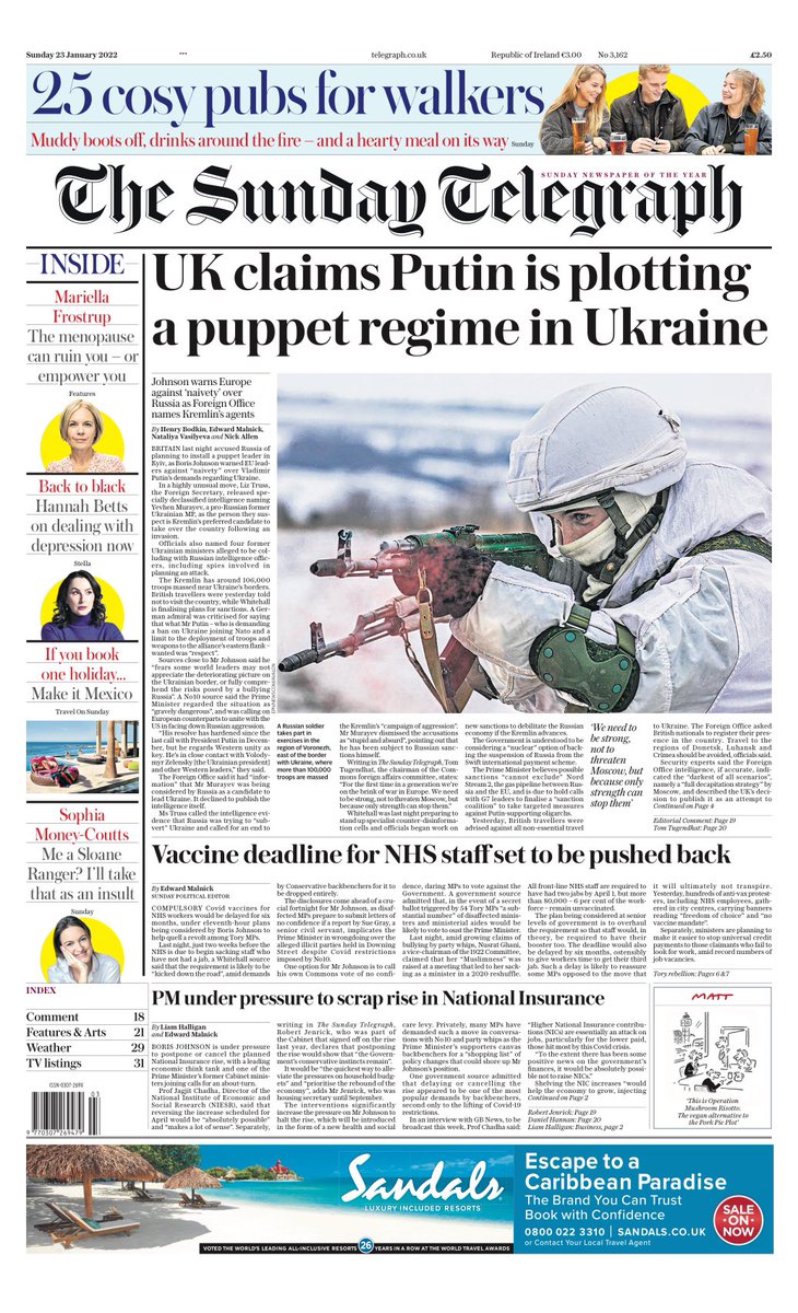 Prime Minister Boris Johnson has accused Russia of plotting to install a puppet leader in Ukraine, according to The Sunday Telegraph.