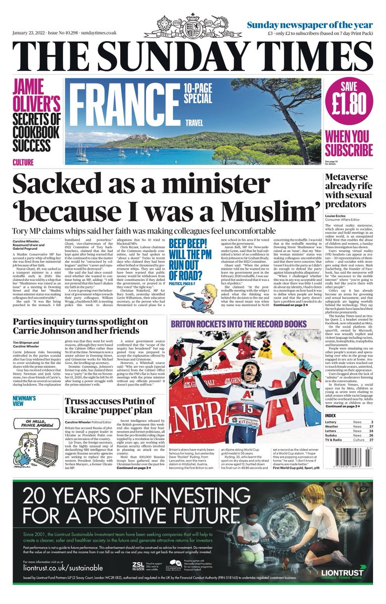 A Muslim Conservative MP has accused a party whip of telling her she was fired from her ministerial job because of her religion, according to The Sunday Times. Nusrat Ghani, 49, claimed she was sacked as transport minister in a 2020 mini-reshuffle because of her faith.