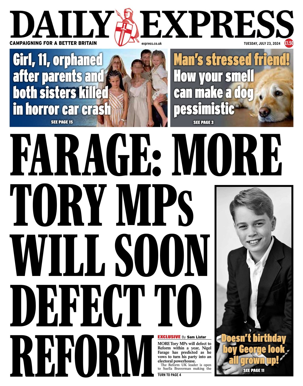 Nigel Farage forecasts that additional Tory MPs will join Reform within a year, reports the Daily Express.