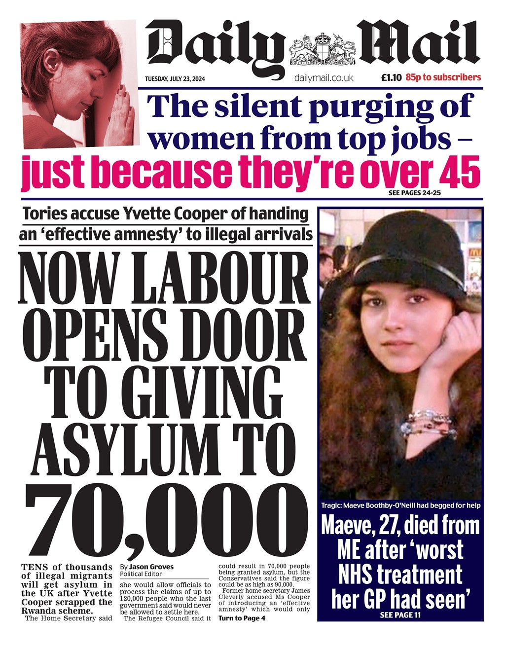 The Daily Mail reports that tens of thousands of illegal migrants may receive asylum in the UK following Yvette Cooper’s cancellation of the Rwanda scheme.