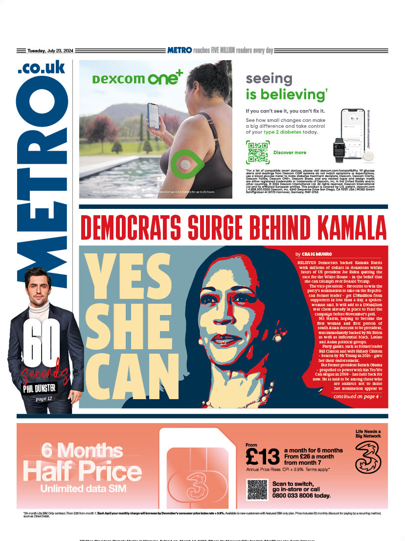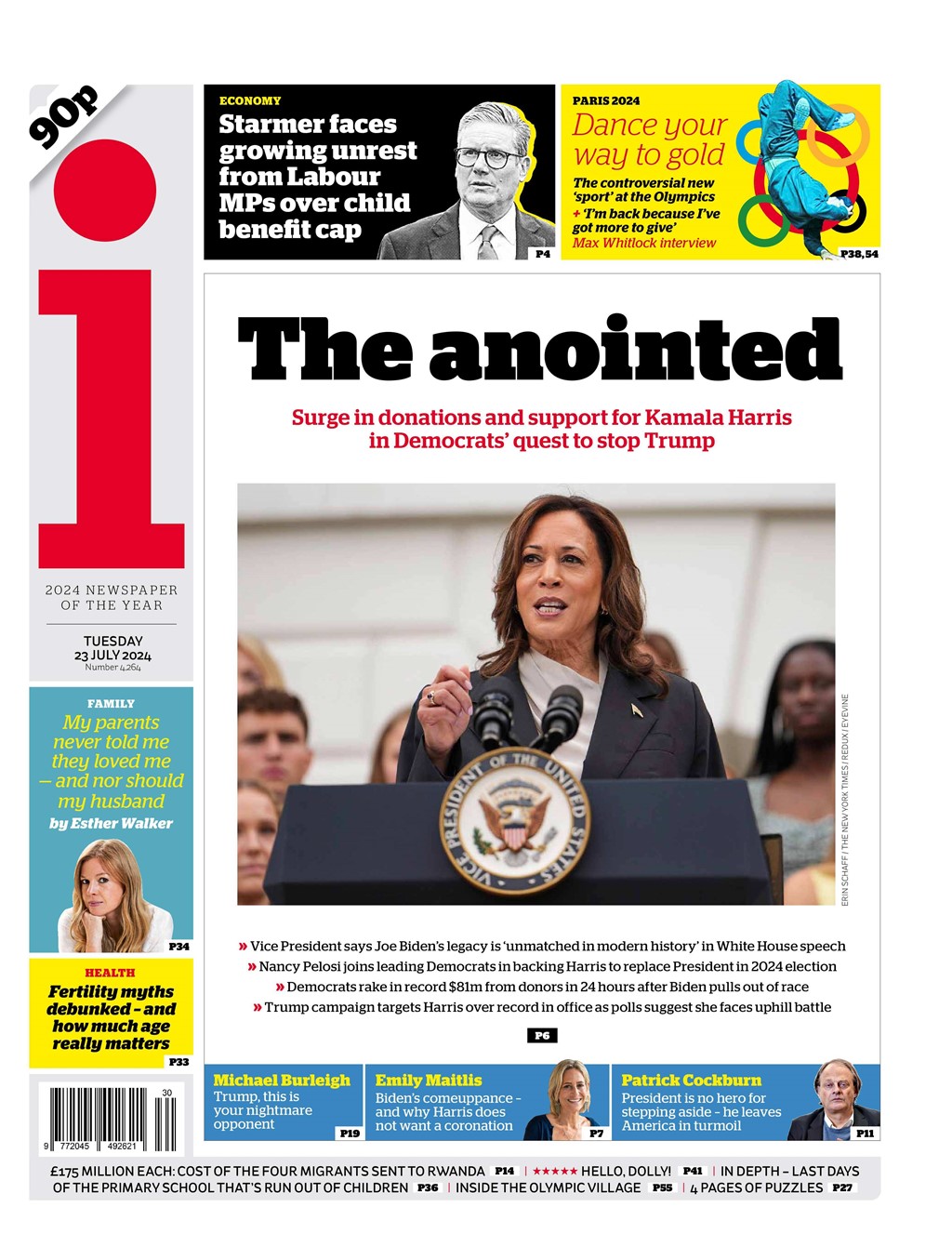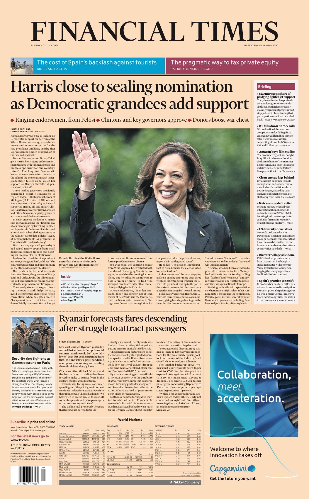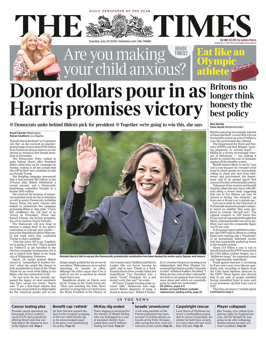 Kamala Harris asserts victory is imminent, reports The Times, noting her record-breaking $230m support from Democrat donors for her presidential bid.