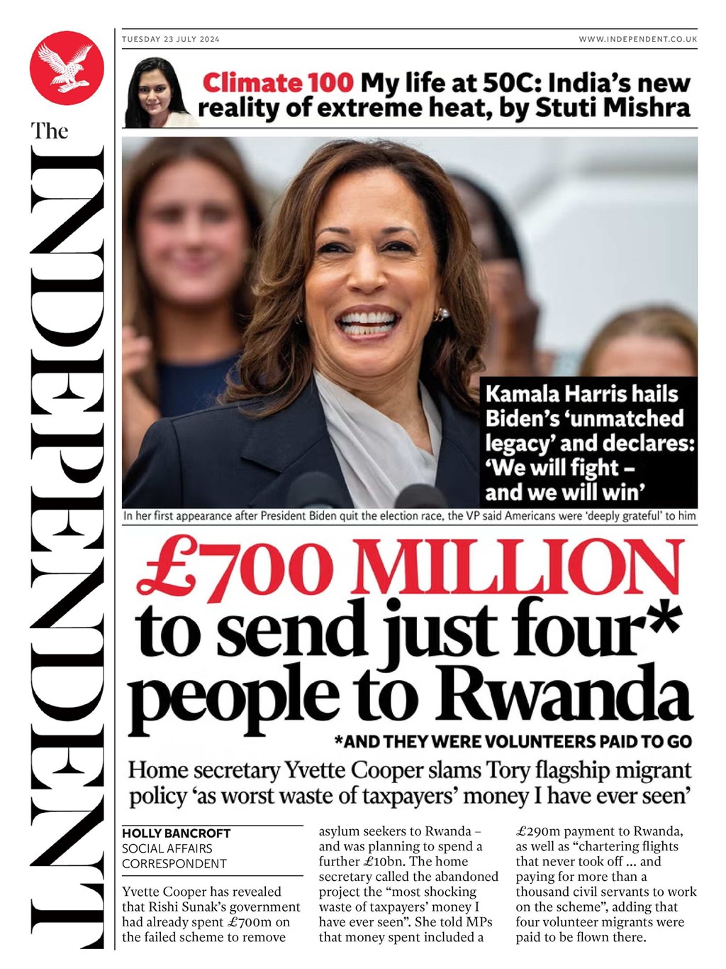 The Independent reports that the home secretary disclosed Rishi Sunak’s government had already spent £700m on the unsuccessful Rwanda scheme.