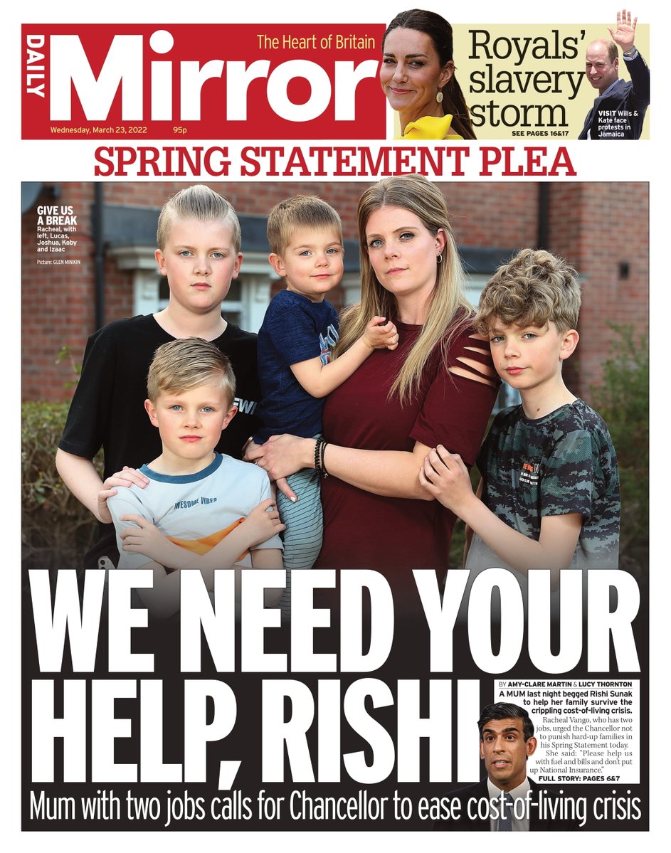 The Daily Mirror leads with a mother who is working two jobs, who asks the chancellor for help with the increasing cost of living.