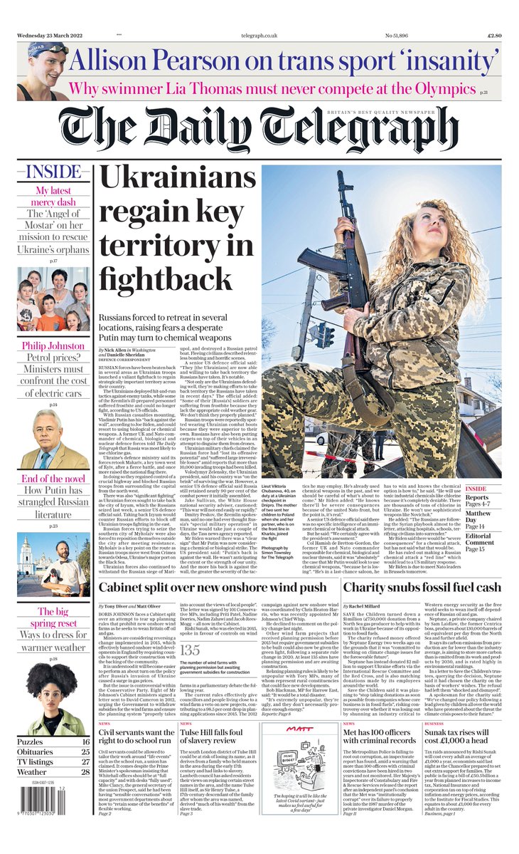 The Daily Telegraph reports on the Ukrainian fightback, as they re-take key territory from the Russians.