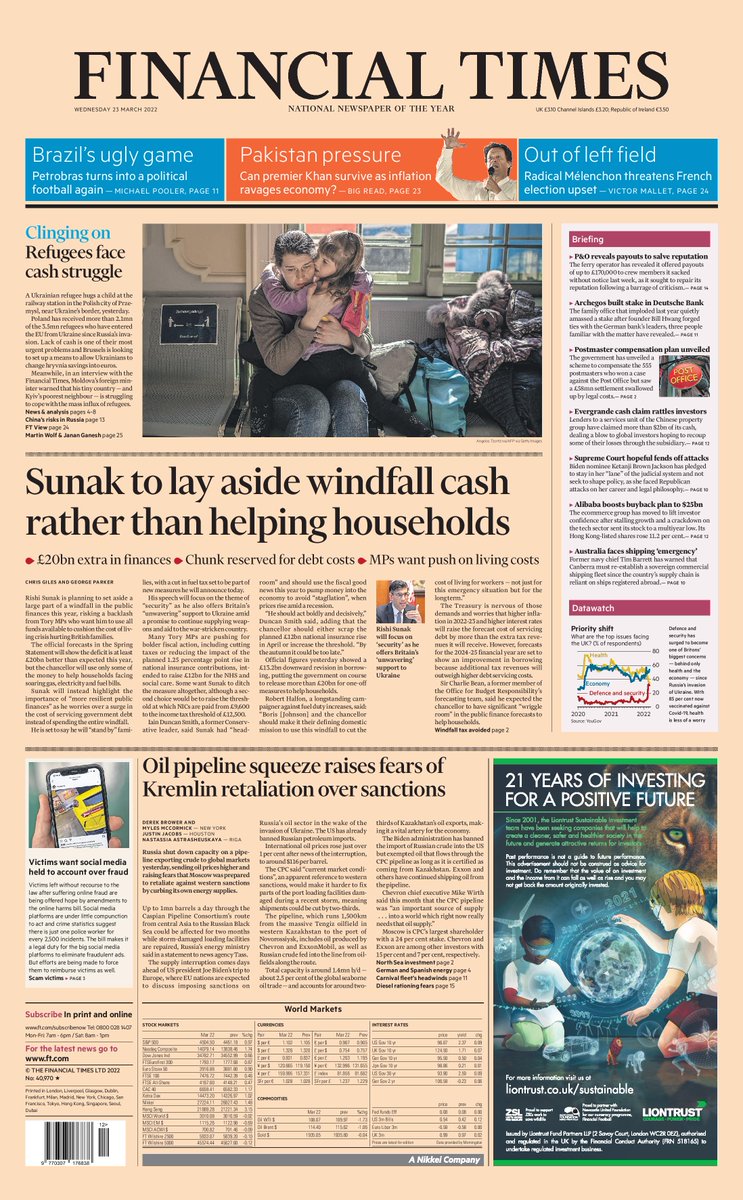 The Financial Times says Rishi Sunak is risking a backlash from Tory MPs who want him to cushion the blow of the cost of living crisis.