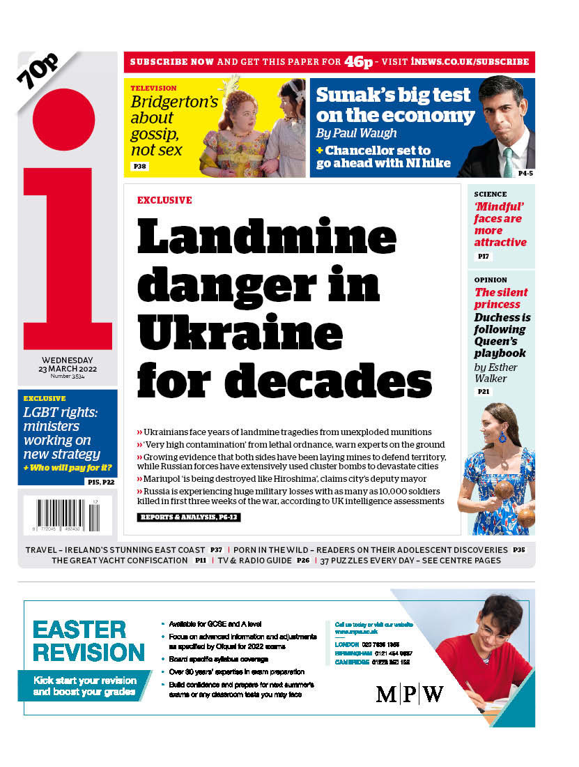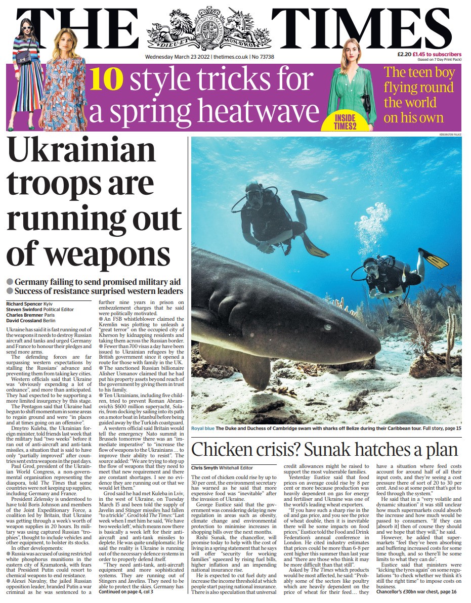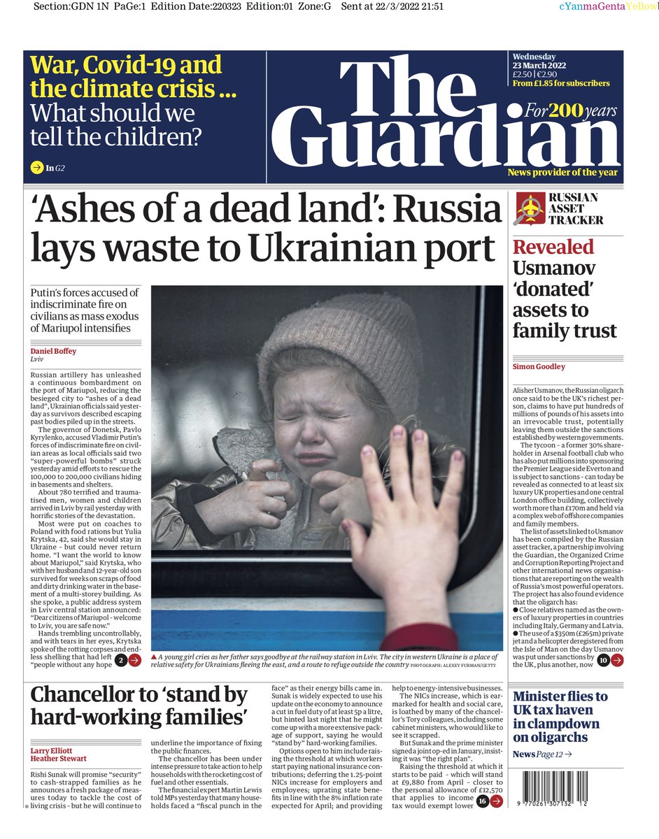 The worsening situation in the Ukrainian city of Mariupol is the lead on the front of The Guardian.