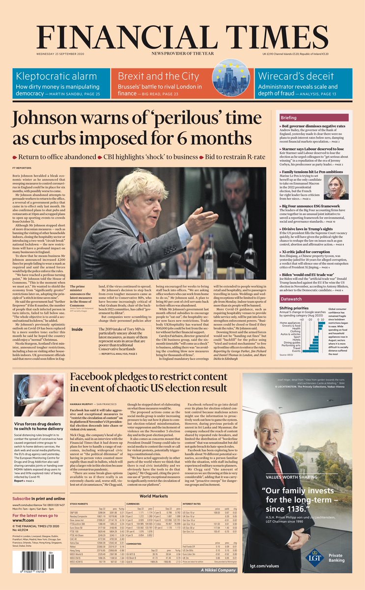 The Financial Times leads on the prime minister’s new coronavirus restrictions and the economic implications of workers being told to work from home again.