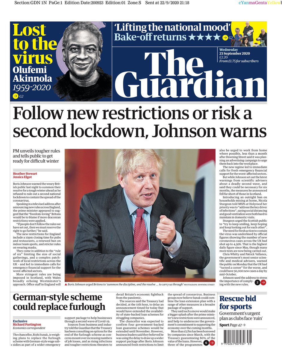 The Guardian focuses on the threat of a second lockdown during the PM’s speech, when he warned the government “reserves the right to go further” if people don’t obey the new rules.