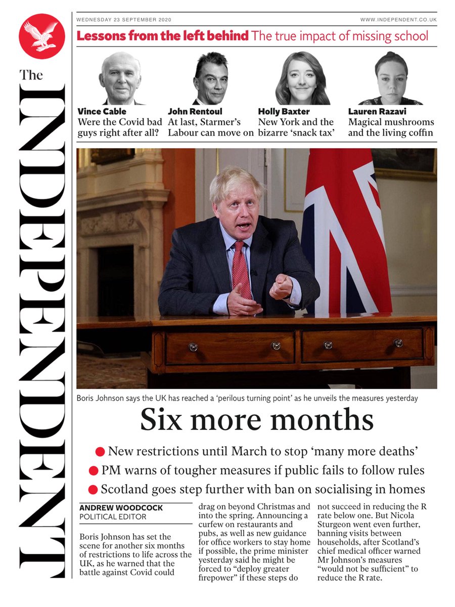 Metro’s front page also focuses on today’s announcement, which it calls ‘the rule of six months’. It came as a further 4,926 coronavirus cases were reported in the UK – the highest daily figure since May.