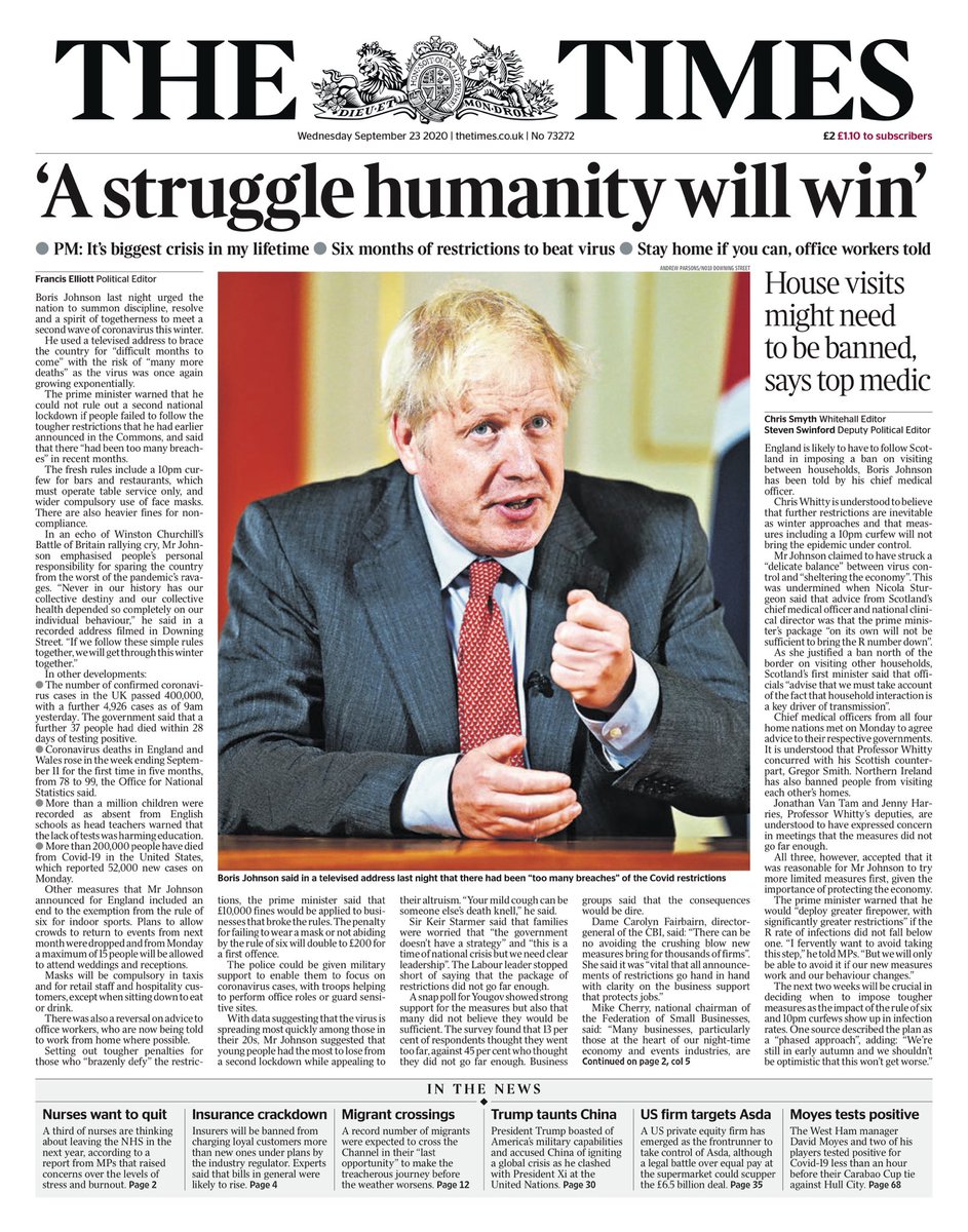 The Times focuses on the more positive side of the PM’s speech, when he claimed that if the UK pulls together to follow the rules, coronavirus will be a “struggle humanity will win”.