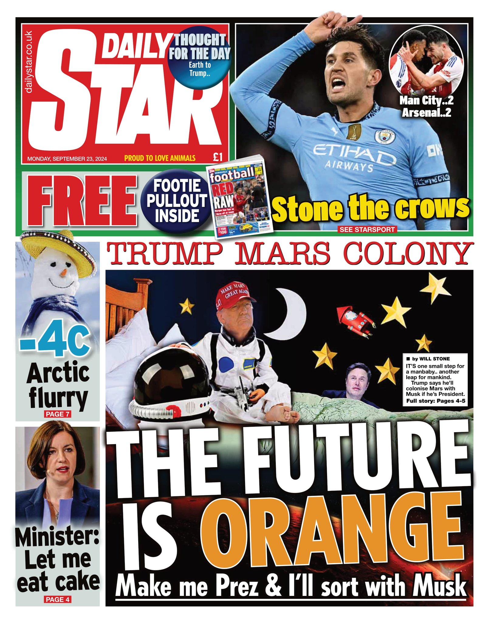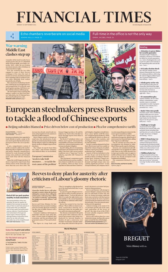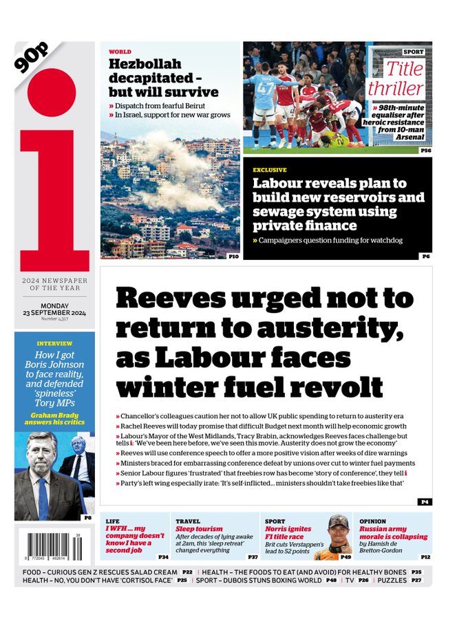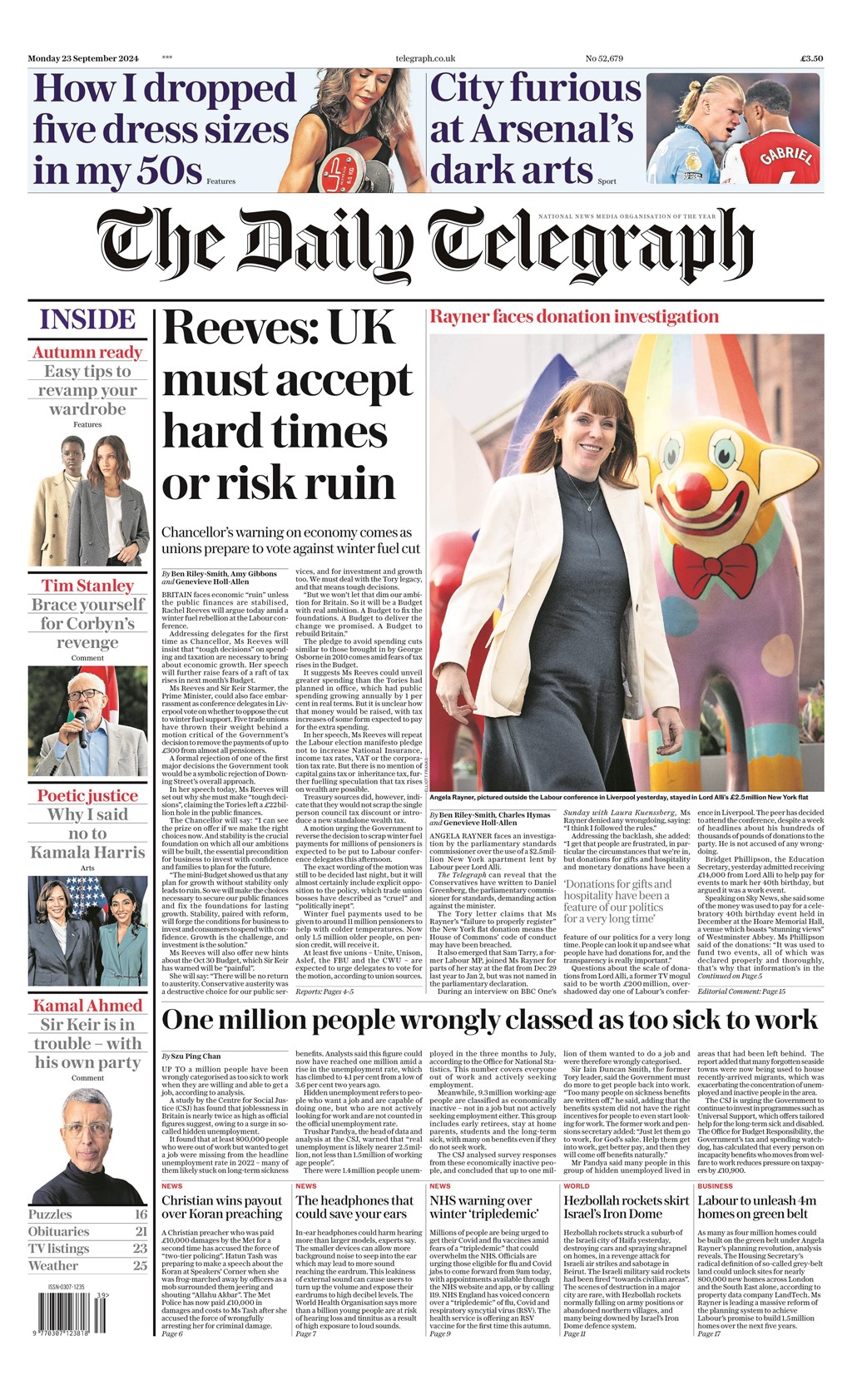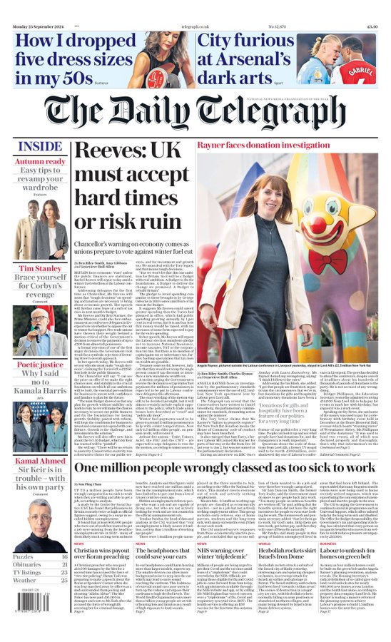 Daily Telegraph Front Page 23rd of September 2024