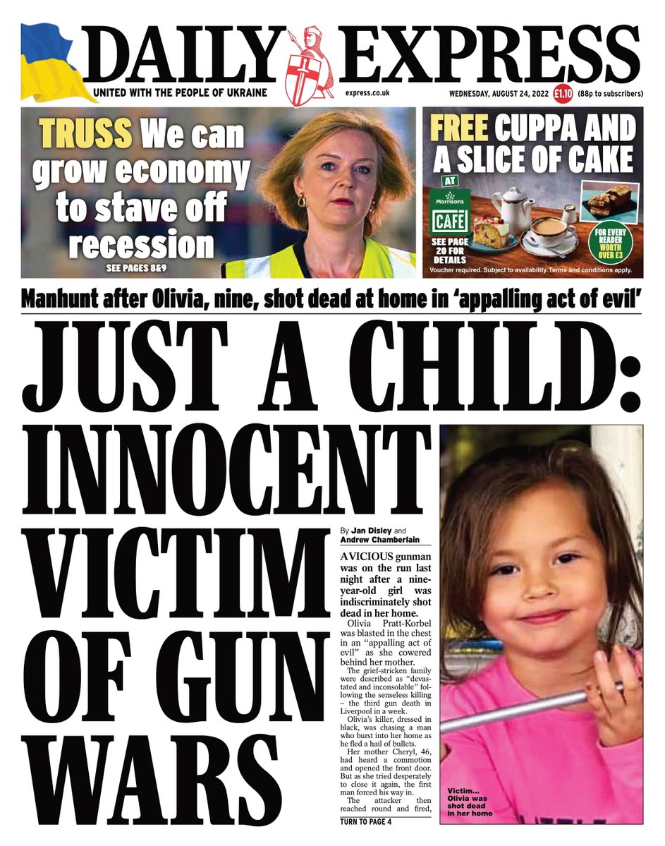 An image of nine-year-old Olivia Pratt-Korbel leads the Daily Mail, which called it a ‘picture of innocence to shame lawless Britain’.