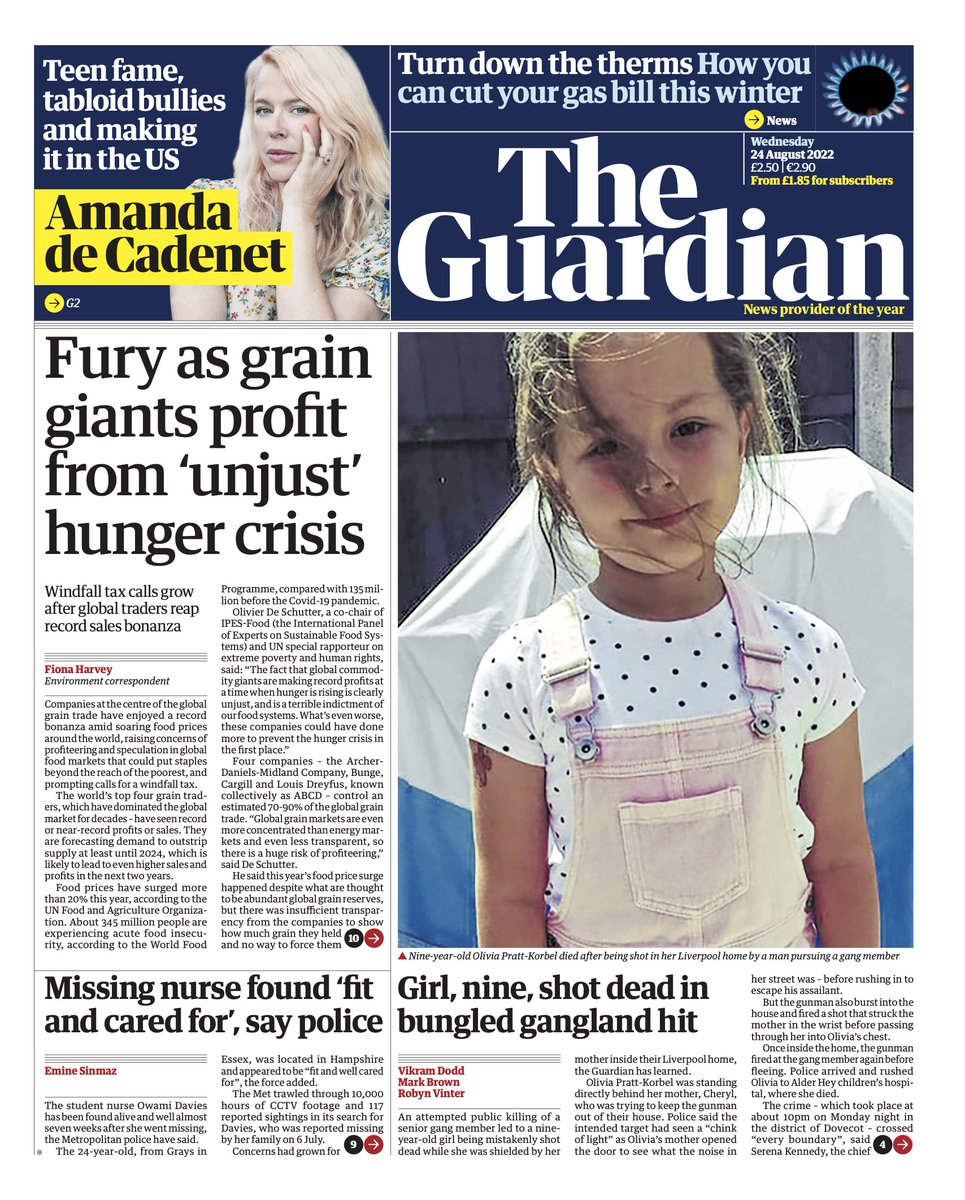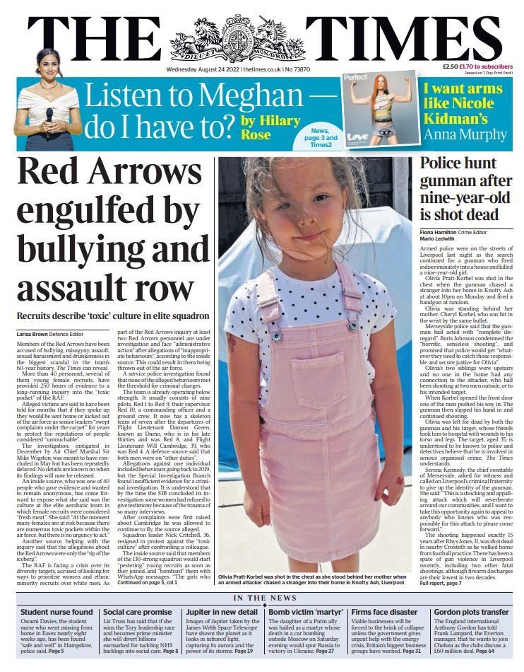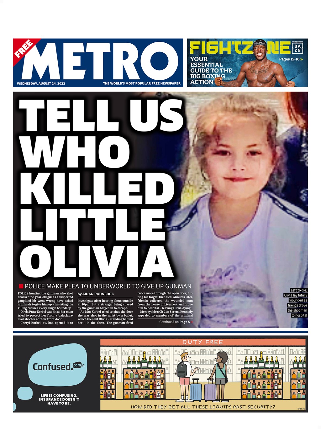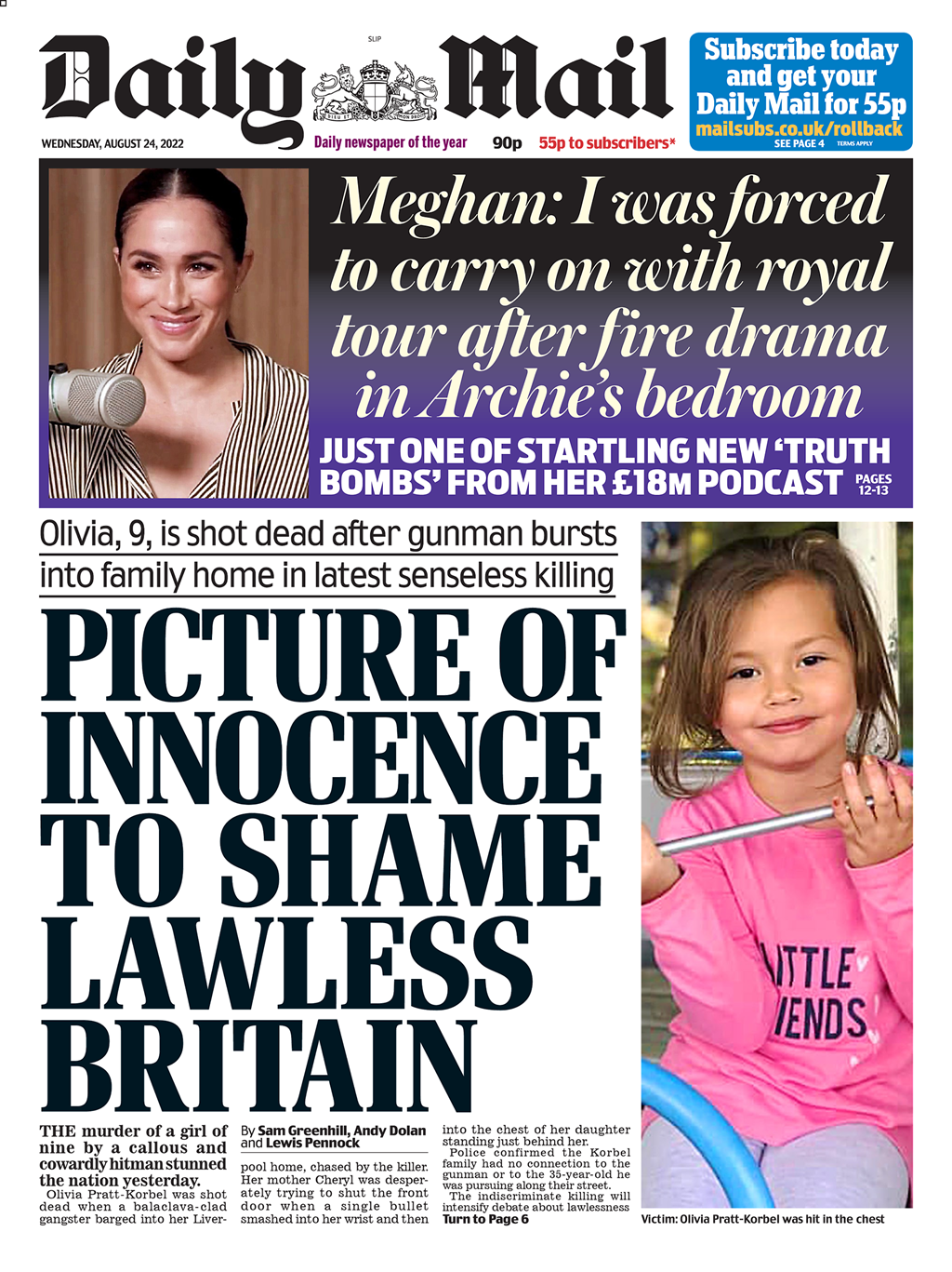 The Daily Mirror covers the fatal shooting of nine-year-old Olivia Pratt-Korbel, describing it as ‘unbearable’.