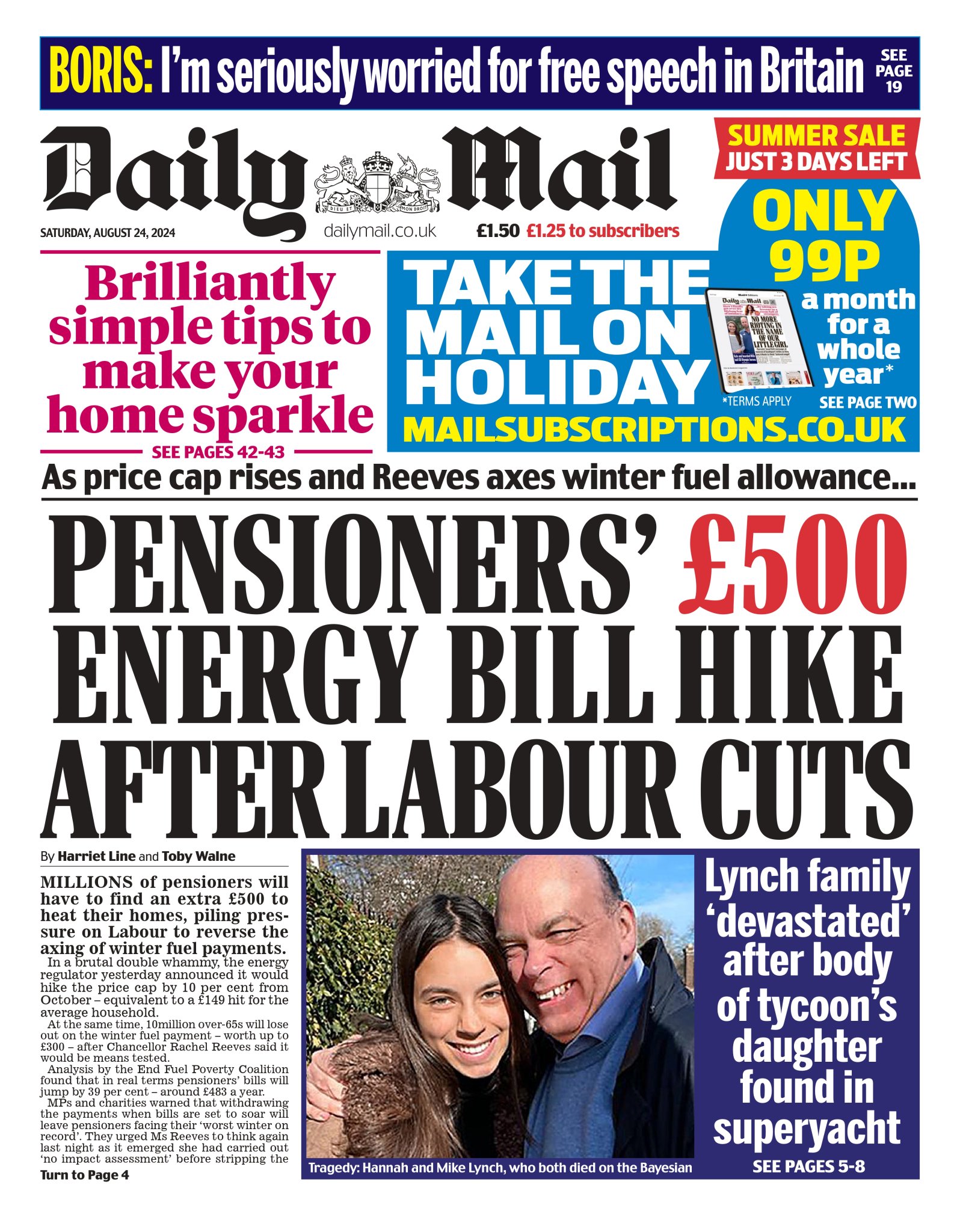 The Independent features tributes to Hannah and Mike Lynch, with the main story highlighting a warning from the Port of Dover about post-Brexit checks potentially paralysing the hub by Easter.
