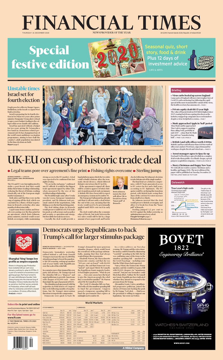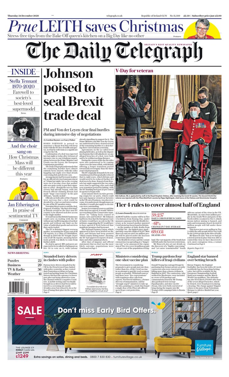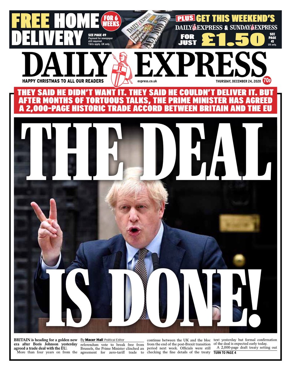 The Daily Mail has claimed “it’s a merry Brexmas” after Boris Johnson was in “touching distance” of securing a Brexit trade deal on Wednesday.