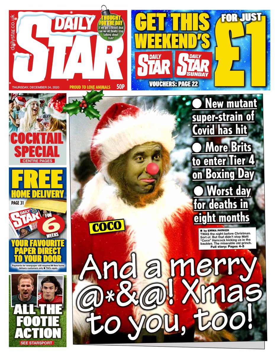 The Daily Star has portrayed Health Secretary Matt Hancock as the Grinch as it reports on the highest number of daily coronavirus deaths in the UK since April.