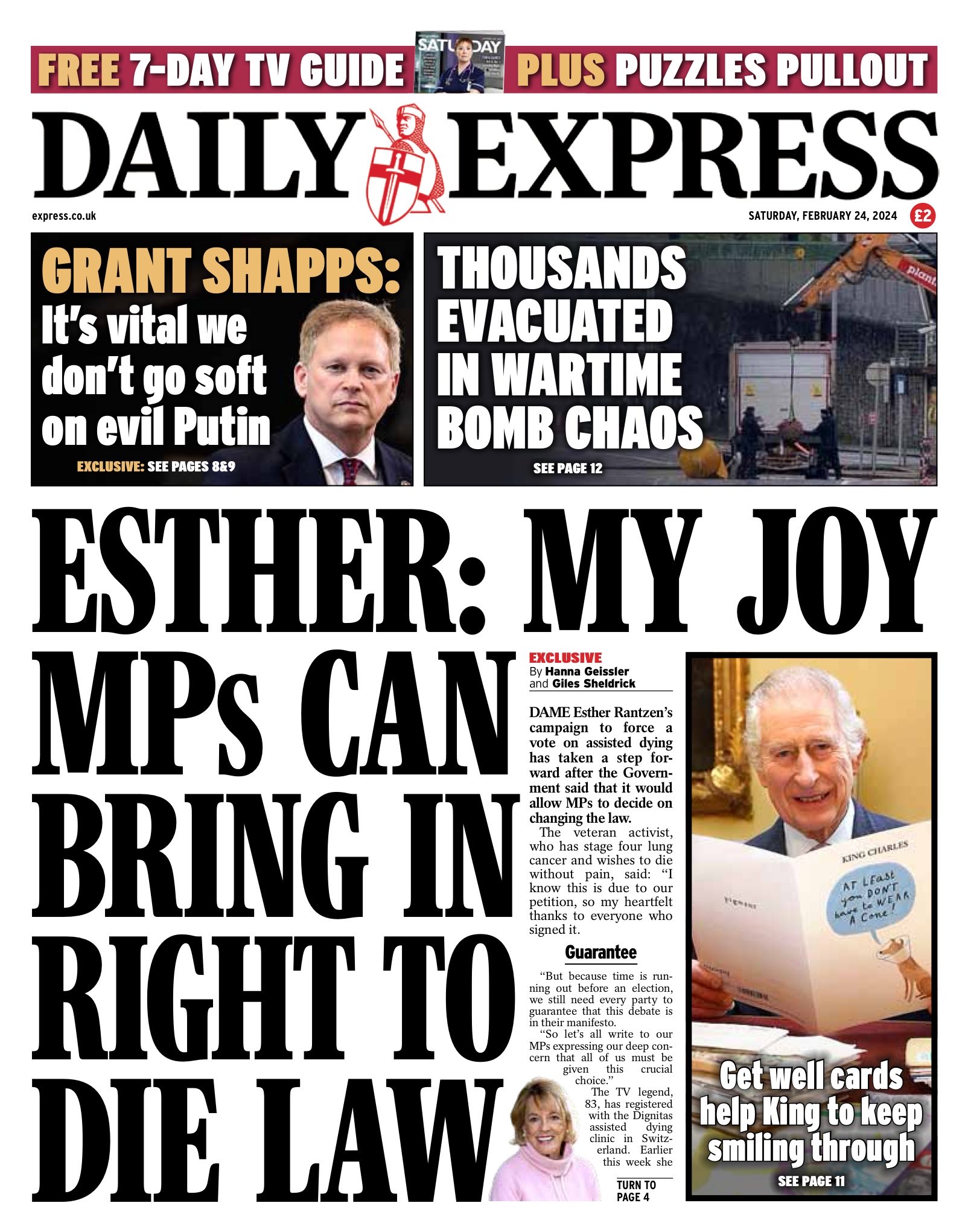 The Daily Express highlights Dame Ester Rantzen’s delight as her euthanasia law change campaign progresses in the House of Commons.