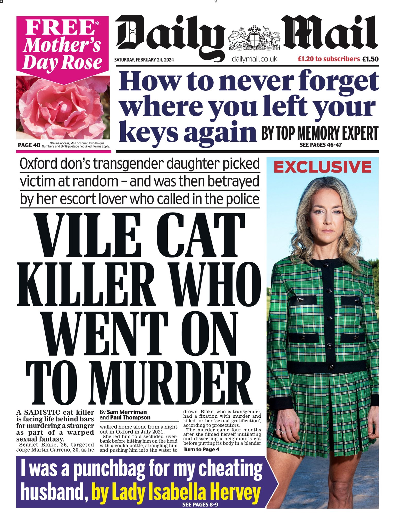 The Daily Mail reports on a transgender woman, previously filmed abusing a cat, now convicted of a street murder in Oxford.