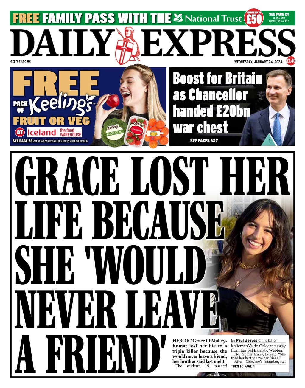 The Daily Express reports on the tragic death of heroic Grace O’Malley Kumar, who was killed by a triple murderer while trying to protect a friend.