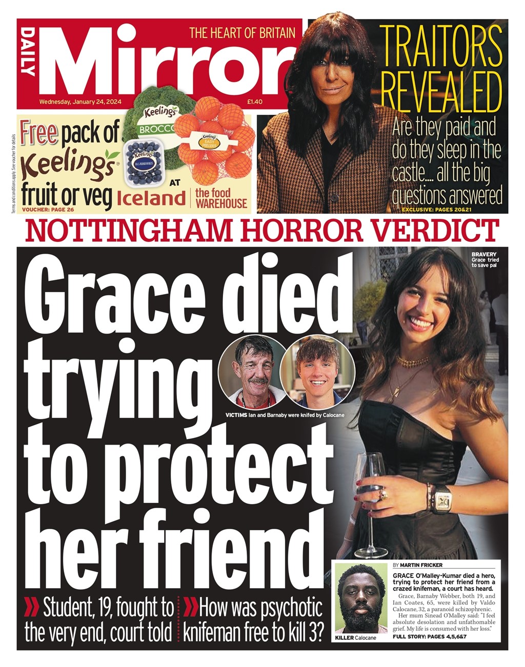 The Daily Mirror reports on Grace O’Malley-Kumar’s heroic death defending a friend from a knife-wielding maniac.