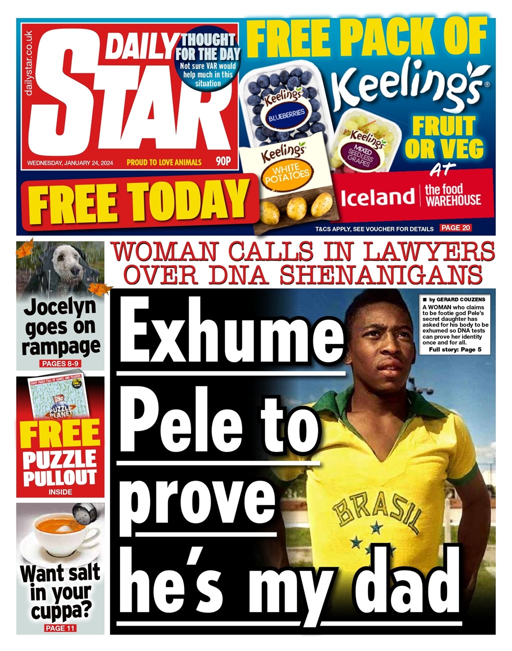 The Daily Star reports on a woman’s request to exhume Pele’s body for DNA verification of her claimed identity as his secret daughter.