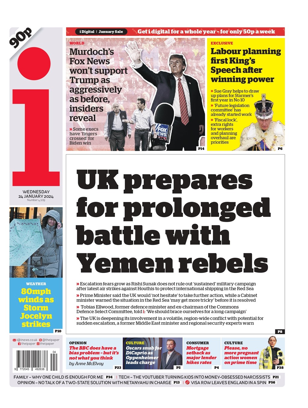 The i highlights fears of a prolonged military campaign as Rishi Sunak doesn’t rule out further strikes on Houthis.