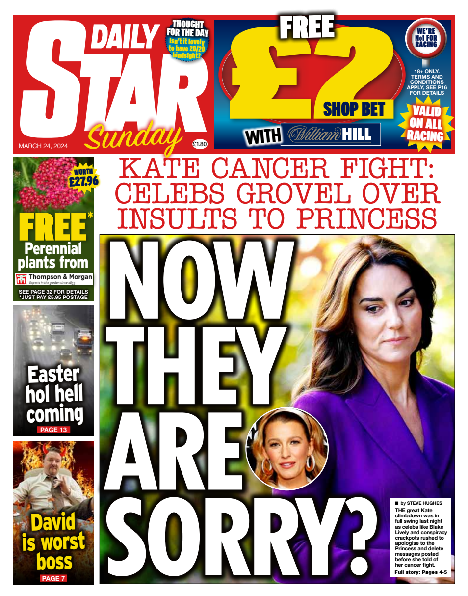 The Daily Star Sunday reports on celebrities apologising for premature comments about Kate’s health.