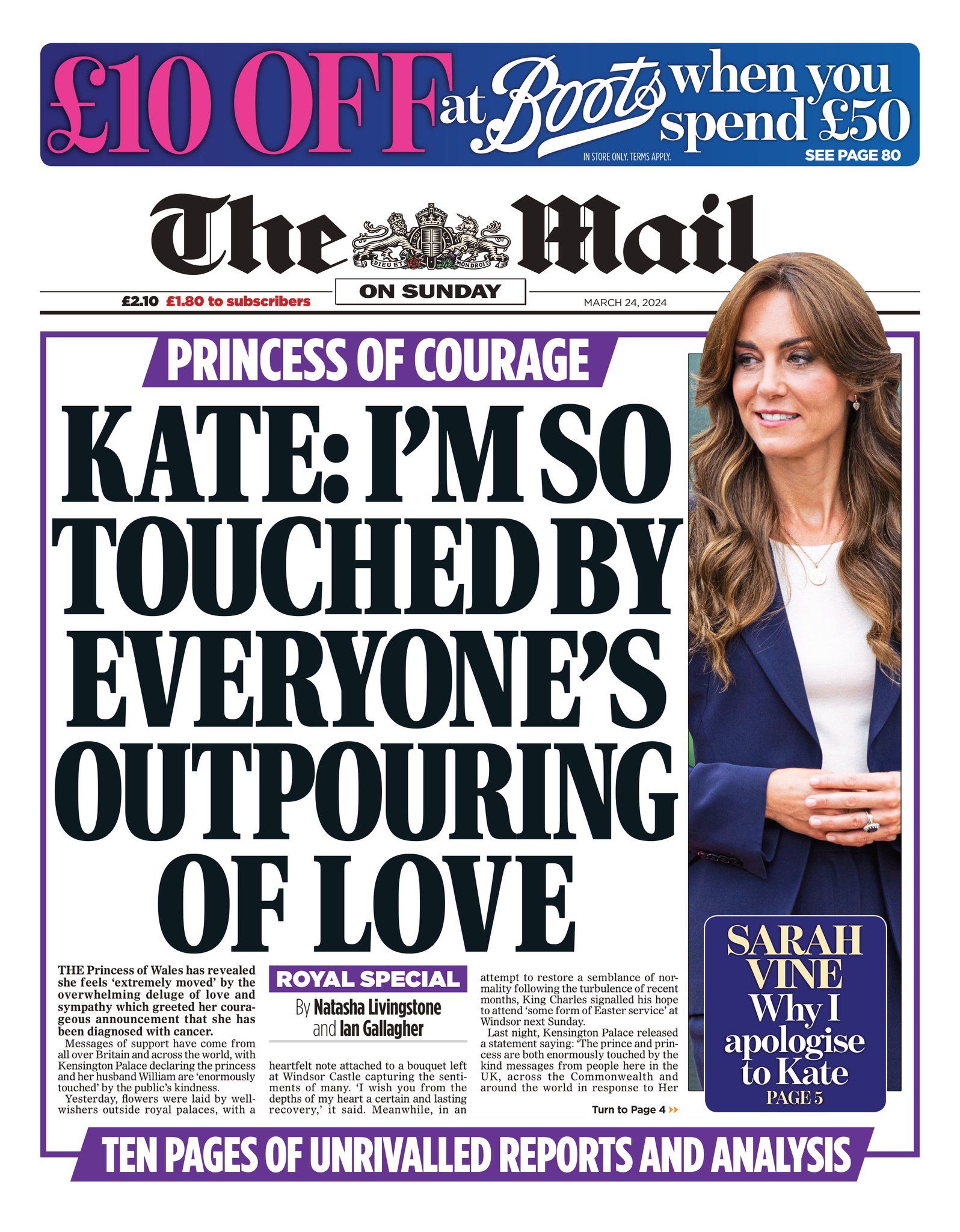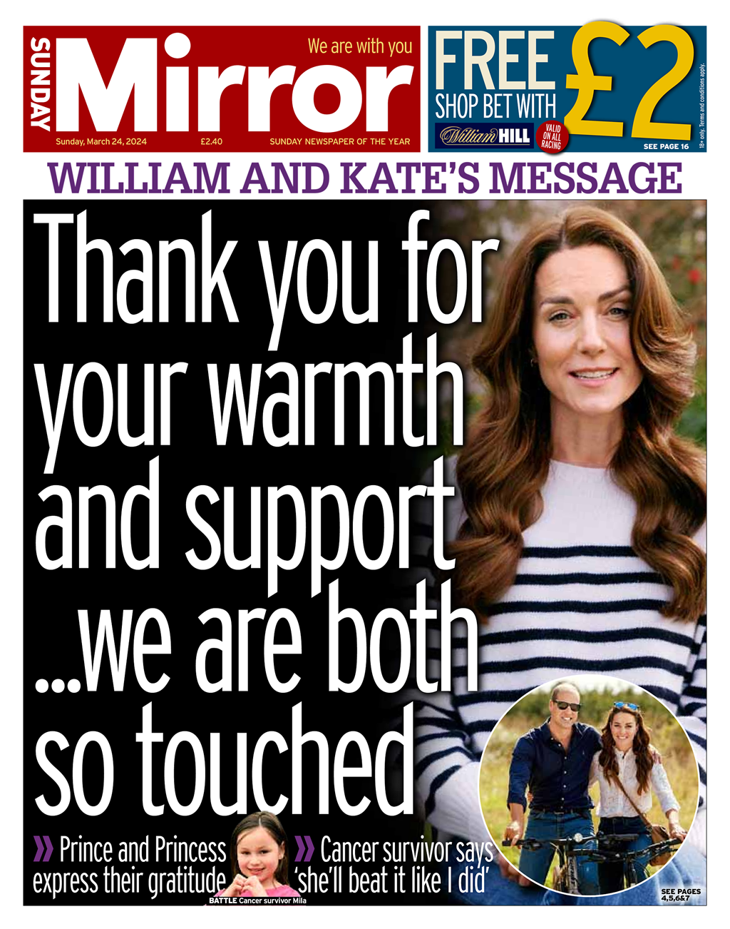 The Sunday Mirror headlines the Princess of Wales’ gratitude for the support she received after her cancer diagnosis.