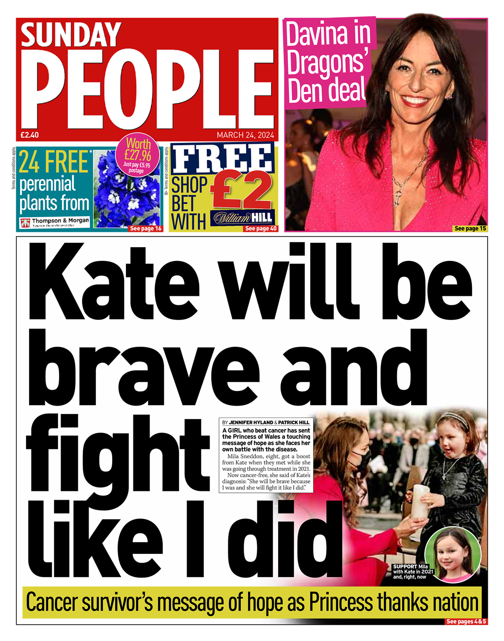 The Sunday People features a heartening encounter between the Princess of Wales and a young cancer survivor.