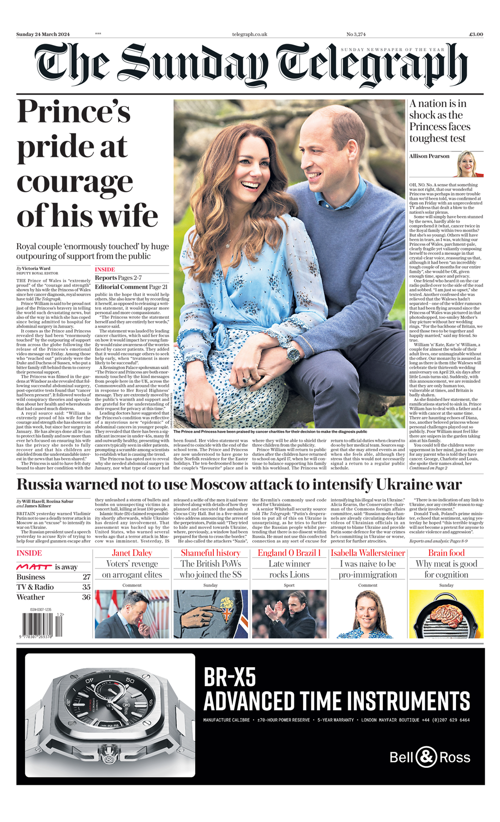 The Sunday Telegraph reports Prince William’s immense pride in his wife’s bravery following her cancer diagnosis.