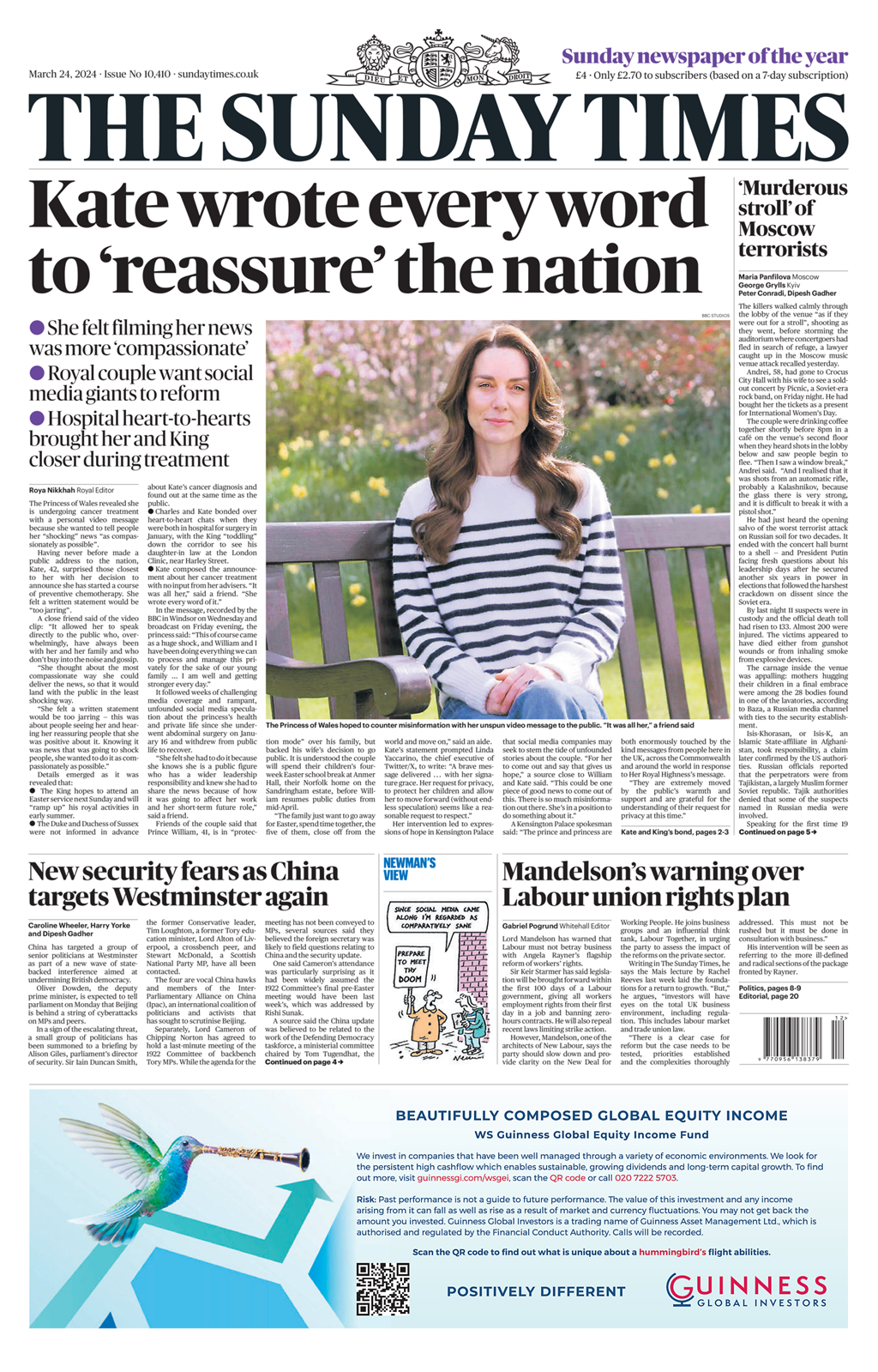 The Sunday Times reveals that the Princess of Wales chose to announce her cancer diagnosis through a video message.