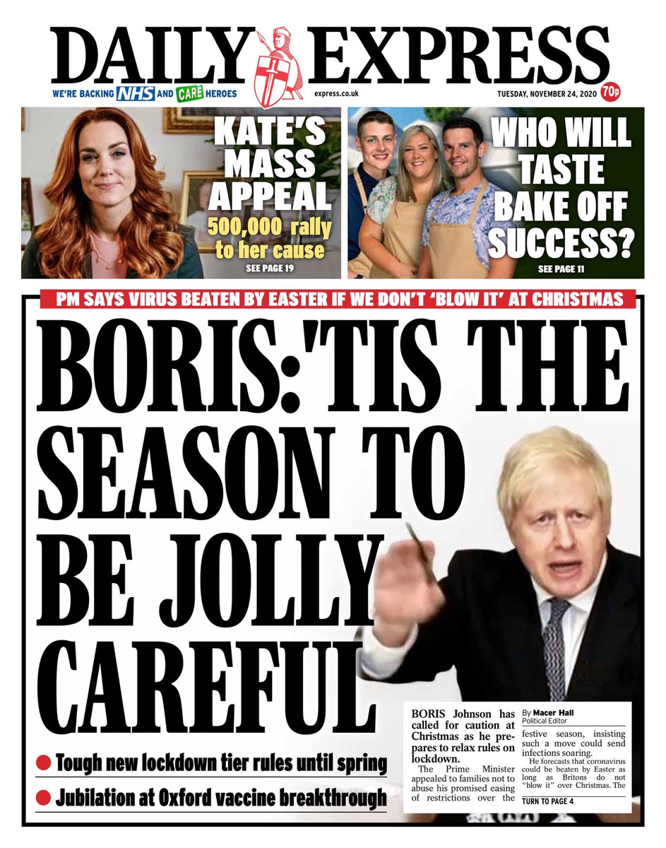 On the front of the Daily Express is an appeal from the prime minister to follow the rules at Christmas in order for a better chance of beating coronavirus by Easter.