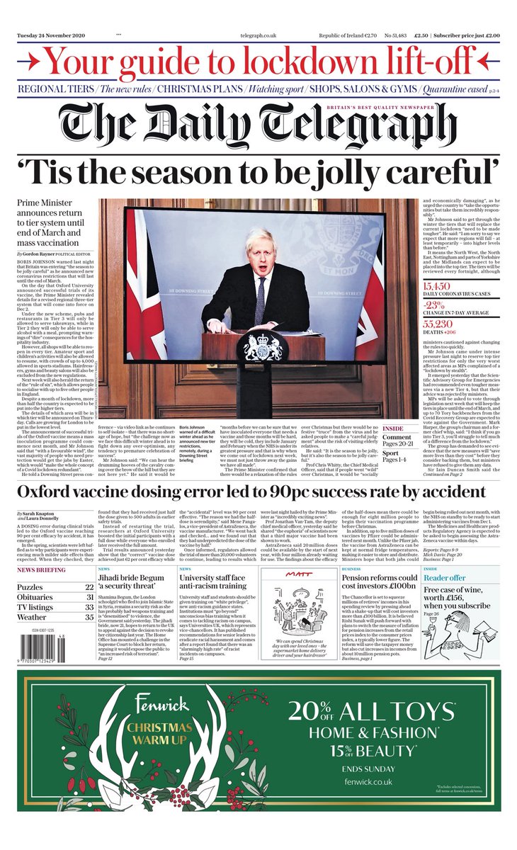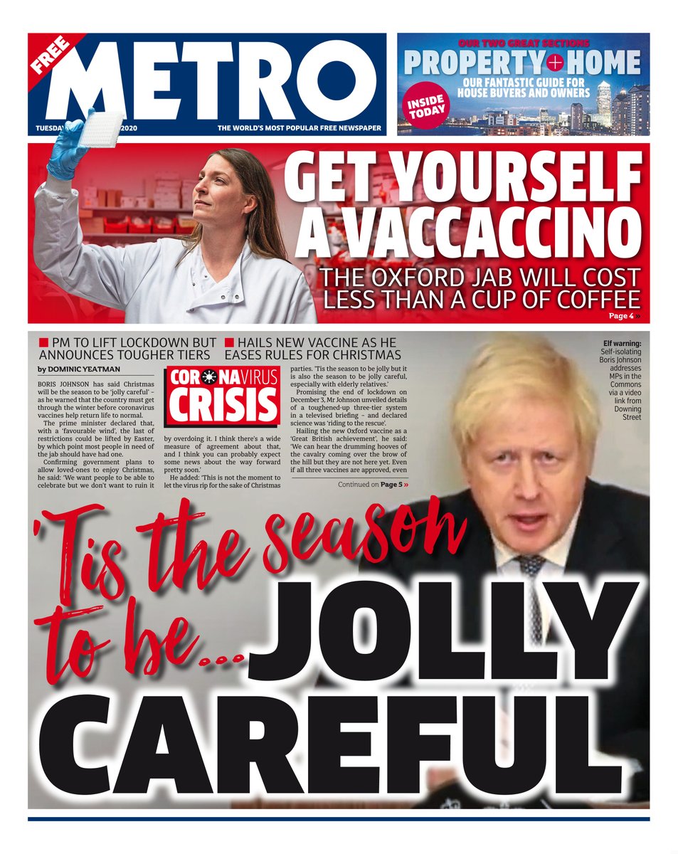 Metro is also leading with a quote from Mr Johnson, who told the nation that Christmas would “be the season to be jolly careful”.