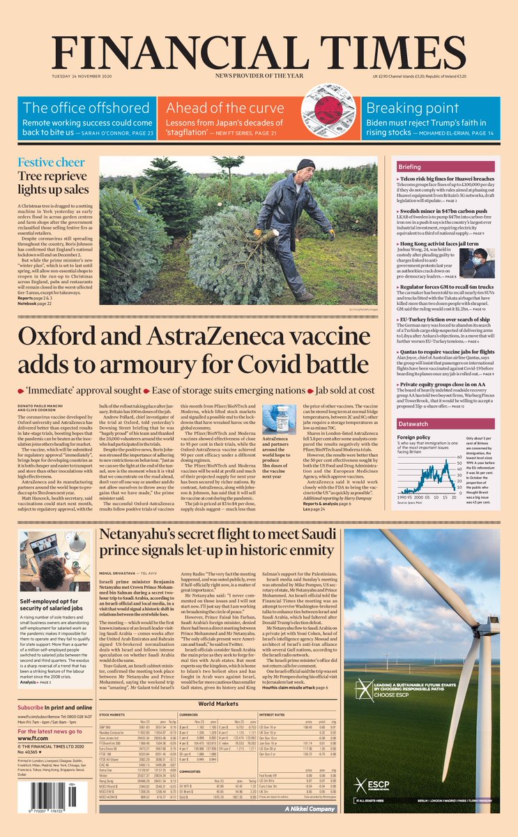 The University of Oxford and AstraZeneca are boosting hopes the coronavirus can be beaten, according to the Financial Times, which reports the partnership vaccine is due to be submitted for regulatory approval “immediately”.