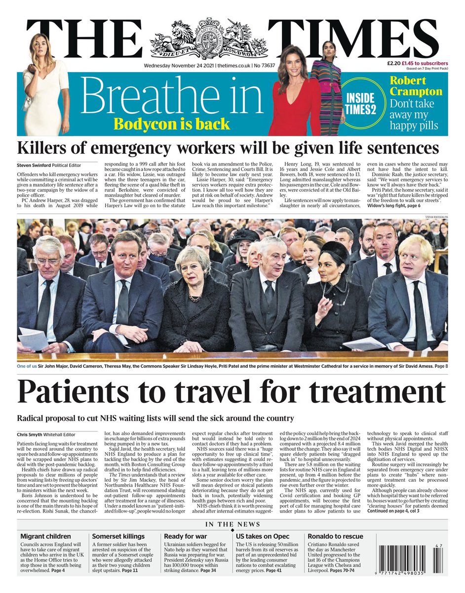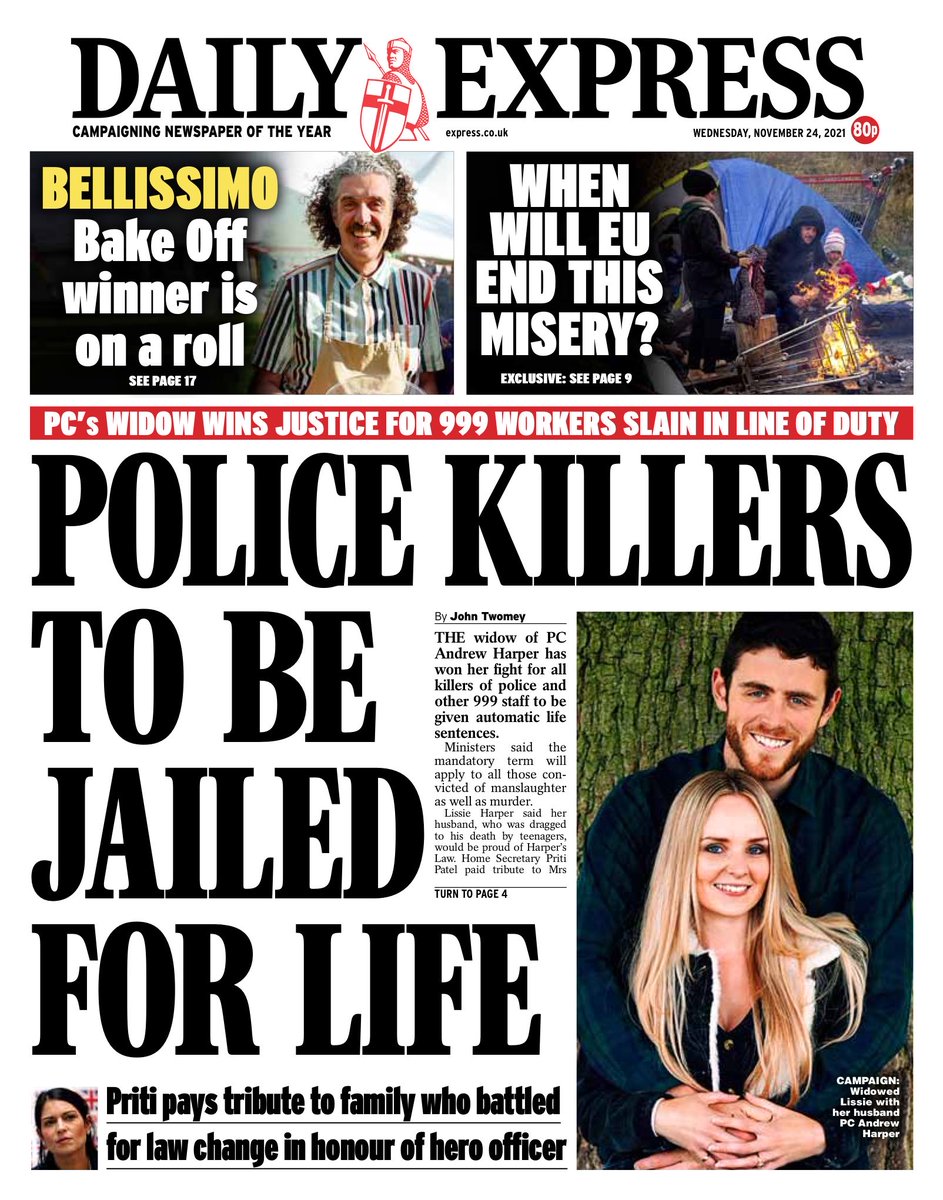 The Express leads on the news the widow of PC Andrew Harper has won her fight for all killers of police and other 999 staff to be given automatic life sentences.