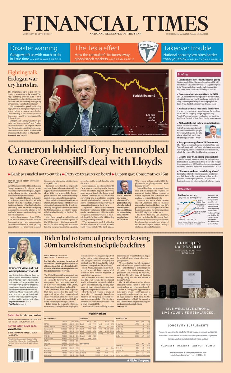 David Cameron lobbied Lloyds Banking group to reverse a decision to cut ties with ailing Greensill Capital, reports the Financial Times.