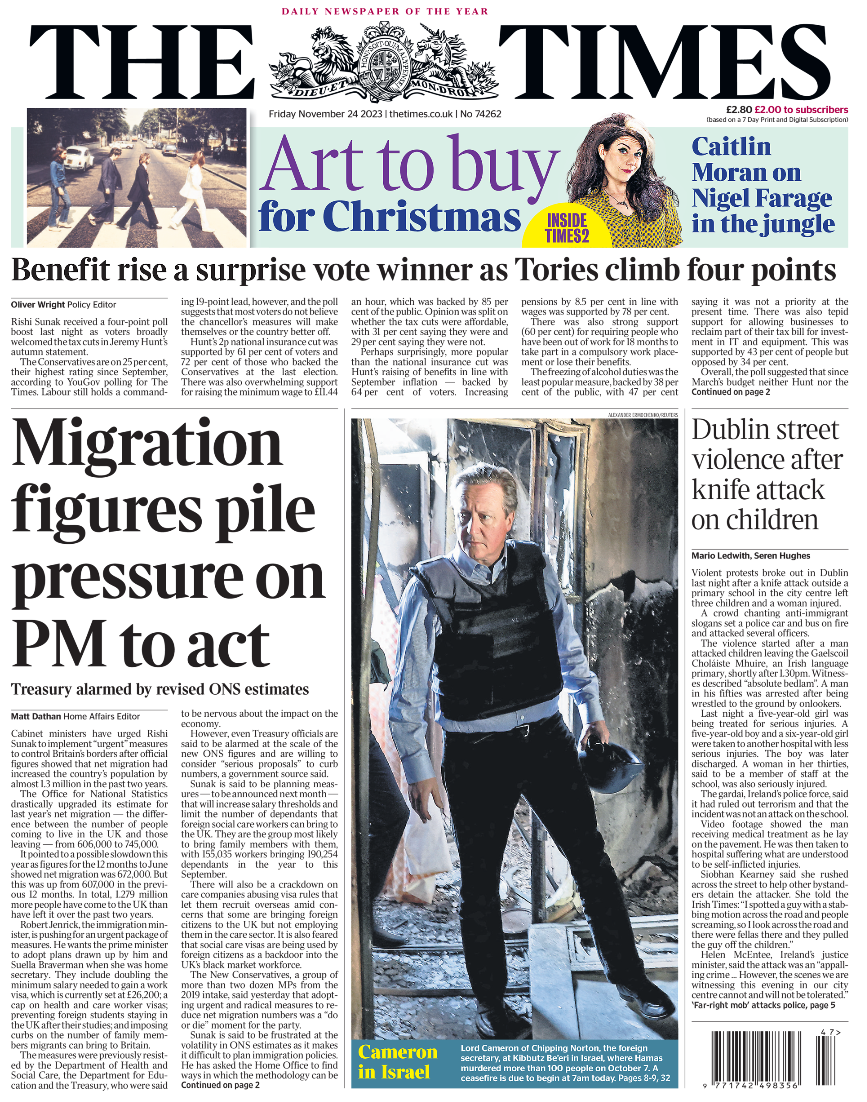 The Times highlights cabinet ministers’ call for Rishi Sunak to urgently reduce net migration.