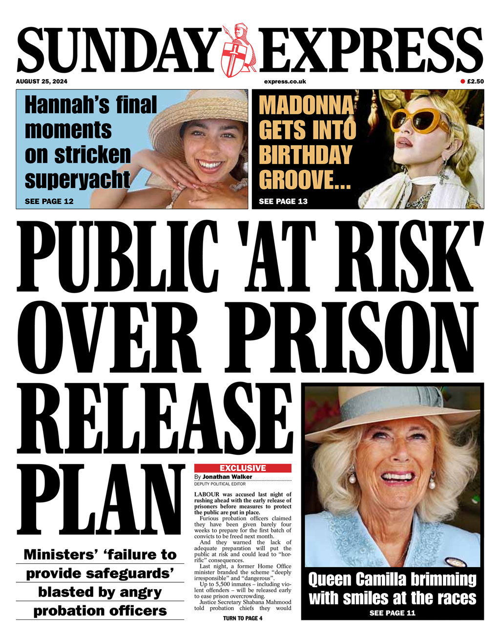 The Sunday Express highlights concerns over early prisoner releases, noting probation officers’ lack of preparation time and potential public safety risks.