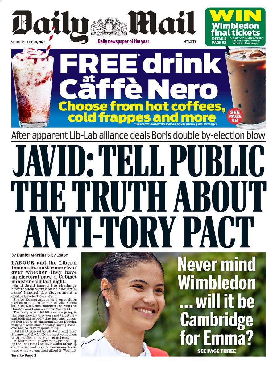 Sajid Javid says Labour and the Lib Dems should be “honest” about their pact, according to the Daily Mail.