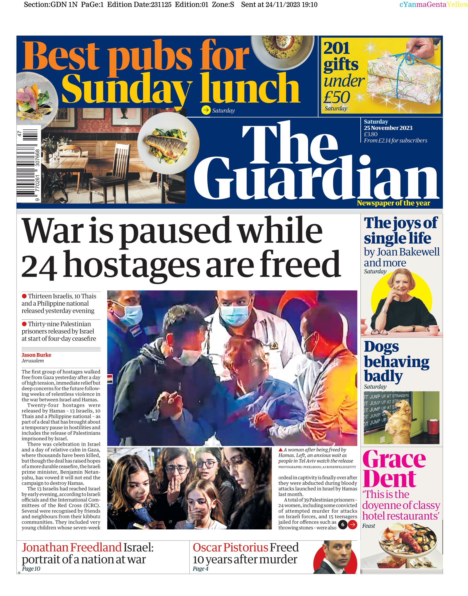 The Guardian’s front page highlights the temporary ceasefire between Israel and Hamas and the freeing of 24 Israeli captives.
