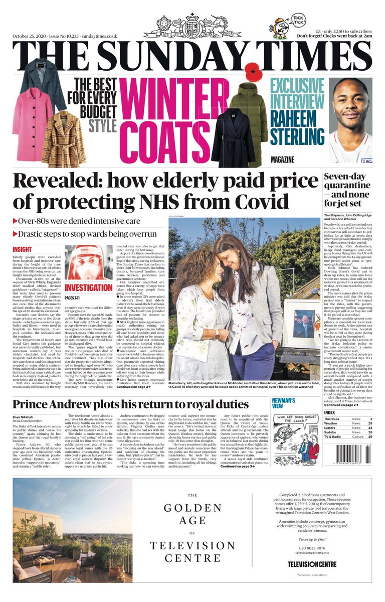 Elderly people were excluded from hospitals and intensive care during the height of the pandemic’s first wave as part of efforts to stop the NHS being overrun, according to The Sunday Times.