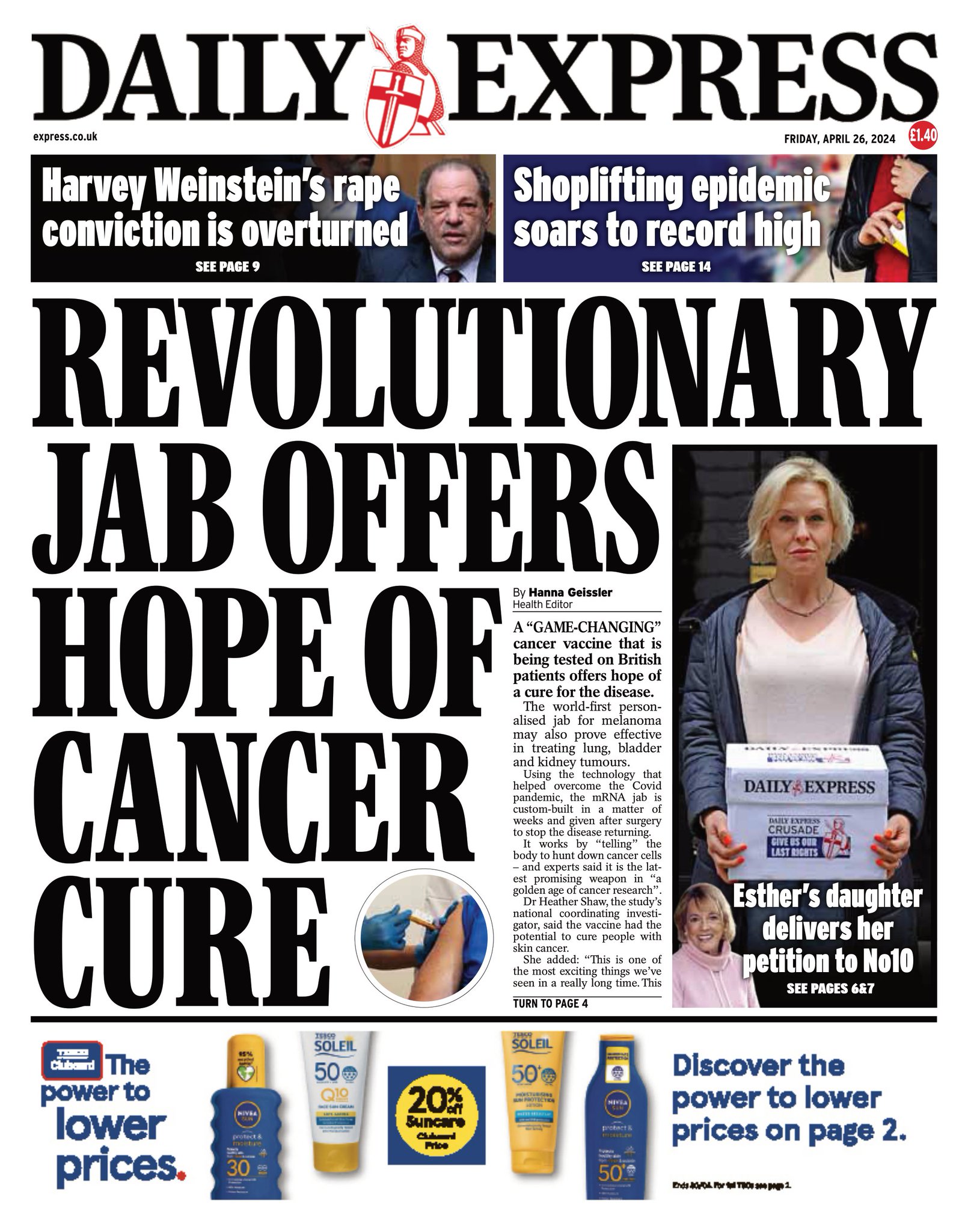 The Daily Express highlights the promising potential of a novel cancer vaccine currently under trial in Britain.