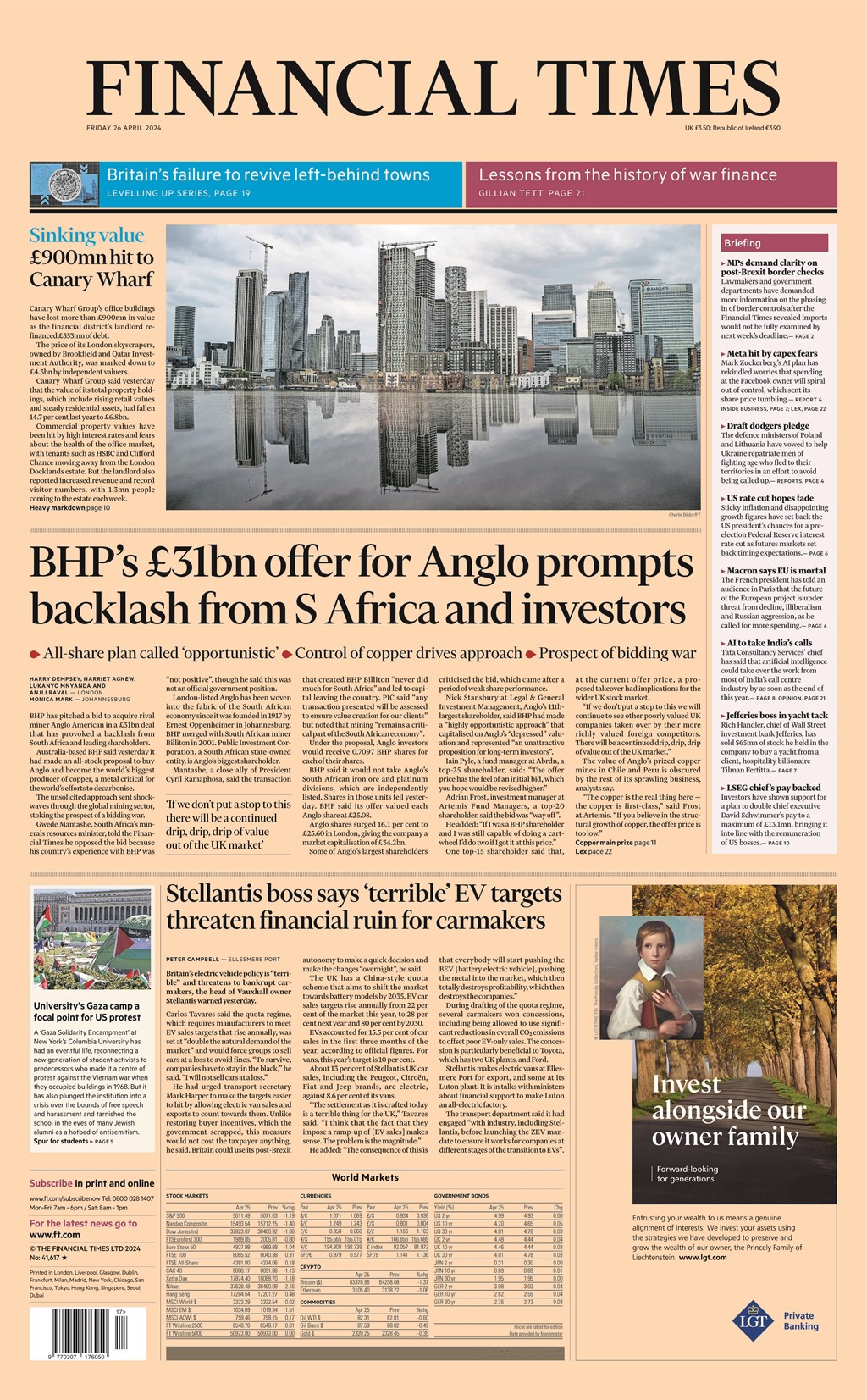 BHP’s £31bn bid for Anglo American stirs dispute, reports the Financial Times.