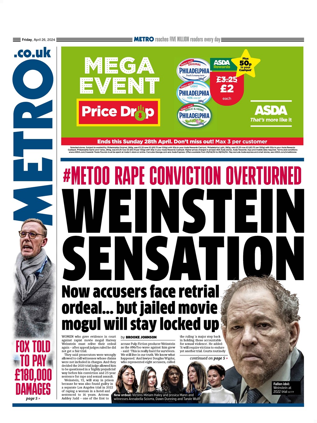 The Metro reports on a New York appeal court’s decision to overturn one of Harvey Weinstein’s rape convictions.