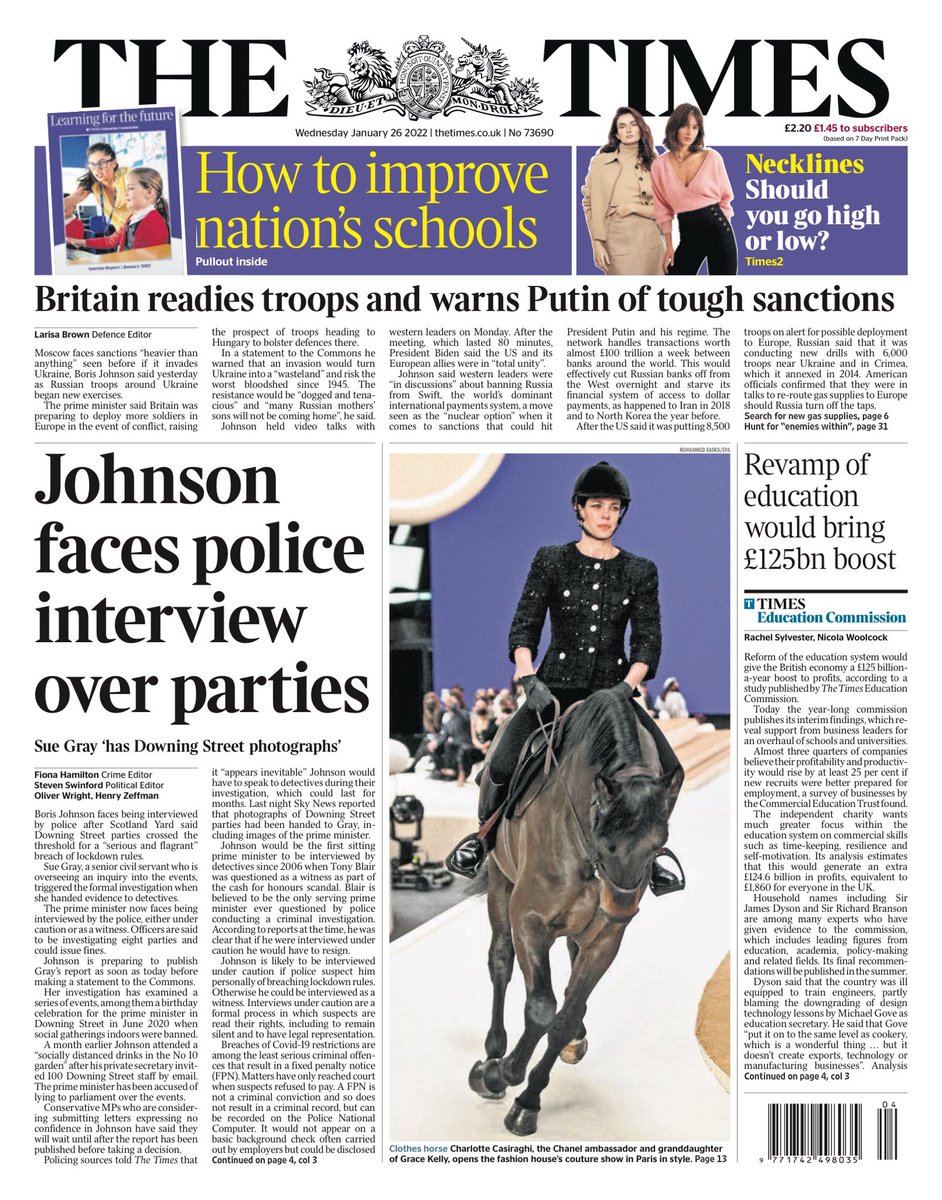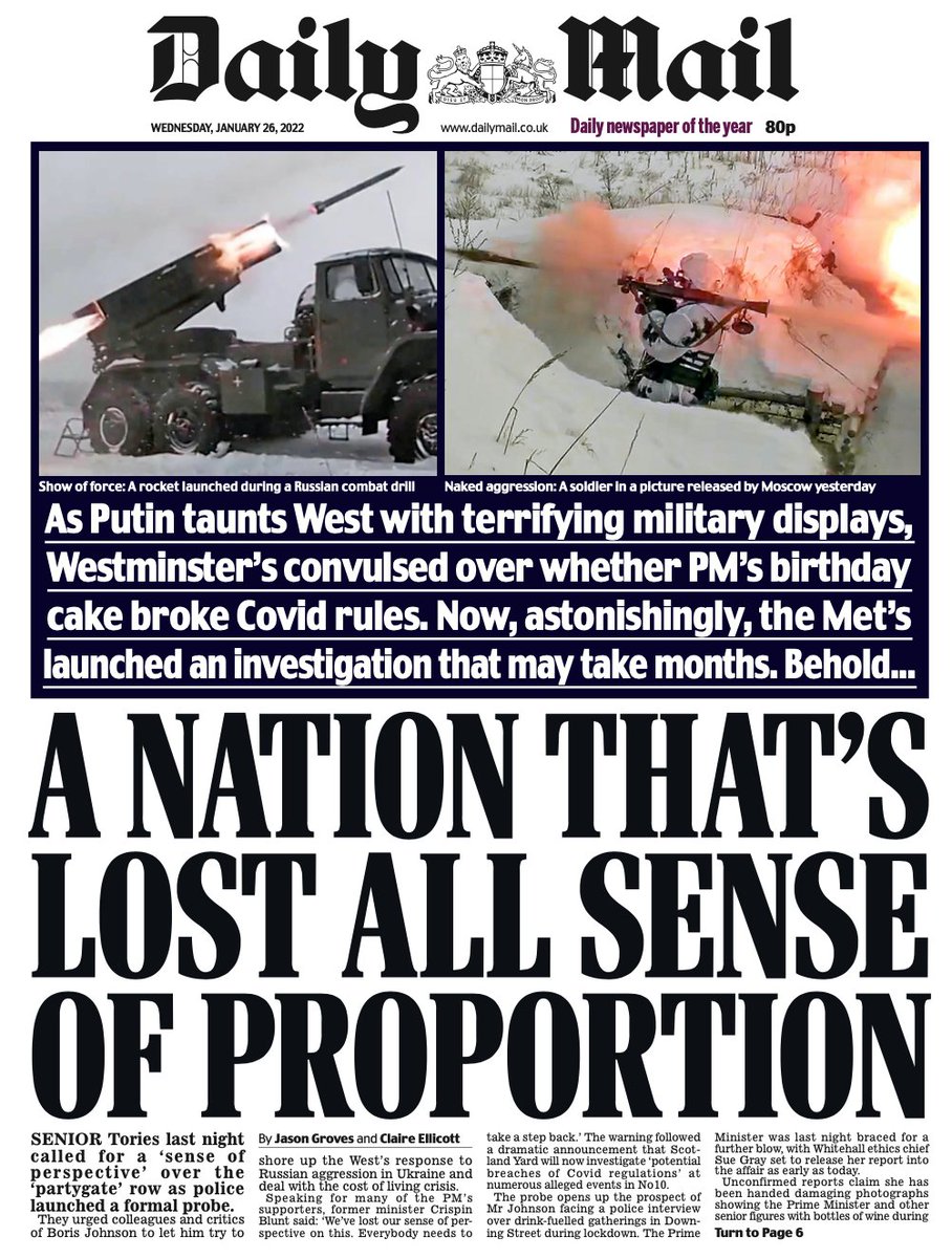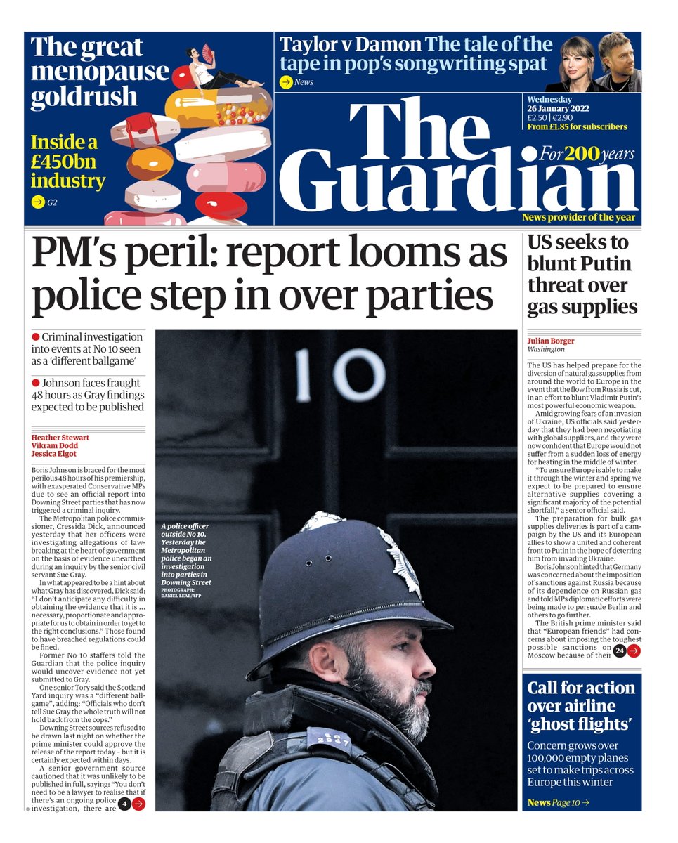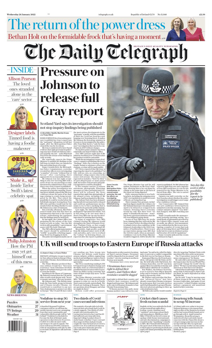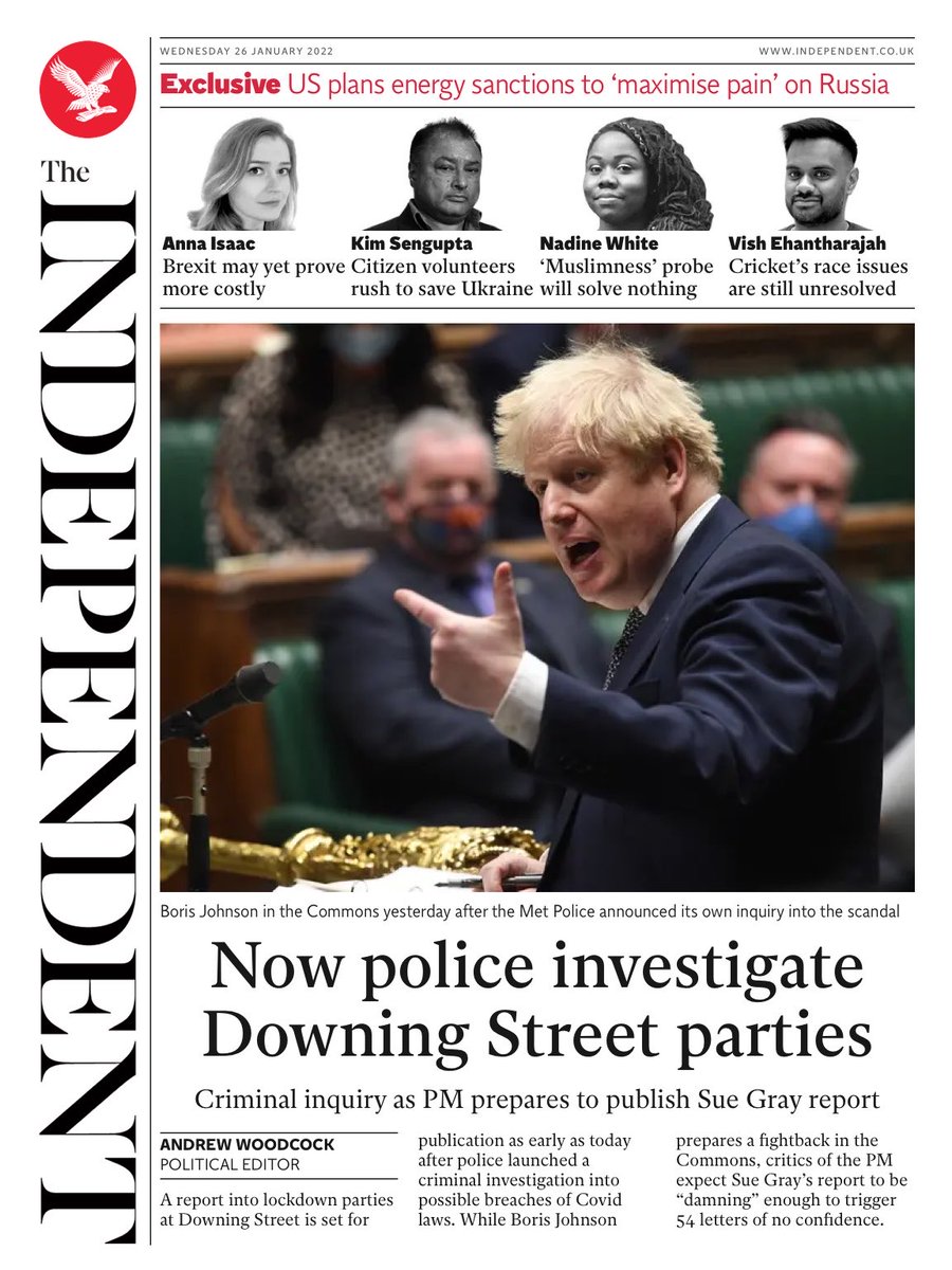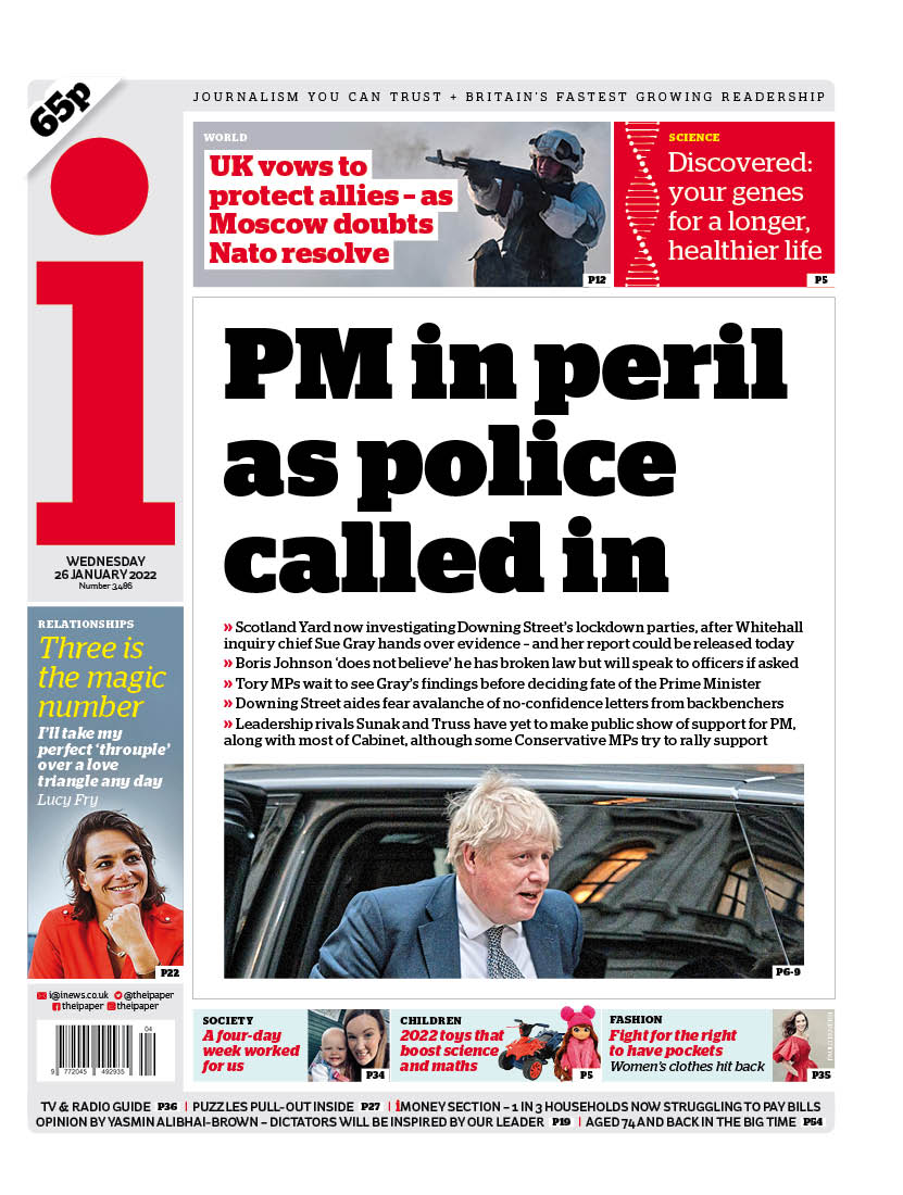 The Independent also leads with the Metropolitan Police investigation into Downing Street parties, adding Sue Gray’s report could be released as early as Wednesday.